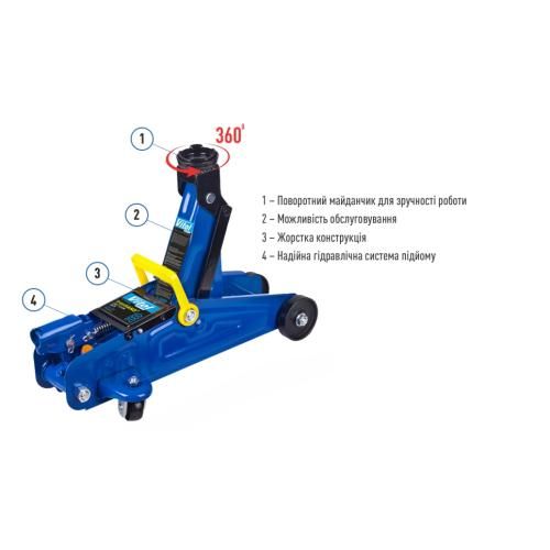 </strong></span></span><br /><span style="font-size:14px;"><span style="font-family:arial,helvetica,sans-serif;">Оптимальне поєднання надійності, безпеки та зручності - основні переваги нашого підкатного домкрата. Особливістю підкатного домкрата є дві пари колесиків, при цьому передня пара поворотна на 360 градусів, що забезпечує найбільш зручне розташування під автомобілем. Зручна ручка та плавний механізм роботи дозволять вам підняти автомобіль з мінімальним фізичним зусиллям. Наш підкатний домкрат забезпечує надійну підтримку та комфорт при кожному використанні.</span></span></span><br /><img src="https://vitol.com.ua/image/size-1/458524.png" /><br /><span style="white-space-collapse: preserve;"><span style="font-size:16px;"><span style="font-family:arial,helvetica,sans-serif;"><strong>1. Поворотна чаша</strong></span></span><br /><span style="font-size:14px;"><span style="font-family:arial,helvetica,sans-serif;">дозволяє оптимально та надійно закріпити домкрат в місці контакту знизу автомобіля</span></span><br /><span style="font-size:16px;"><span style="font-family:arial,helvetica,sans-serif;"><strong>2. Спускний клапан</strong></span></span><br /><span style="font-size:14px;"><span style="font-family:arial,helvetica,sans-serif;">дозволяє плавно і без зусиль повернути домкрат у вихідне положення</span></span><br /><span style="font-size:16px;"><span style="font-family:arial,helvetica,sans-serif;"><strong>3. Захисний клапан</strong></span></span><br /><span style="font-size:14px;"><span style="font-family:arial,helvetica,sans-serif;">захищає домкрат від перевантаження</span></span><br /><span style="font-size:16px;"><span style="font-family:arial,helvetica,sans-serif;"><strong>4. Зйомна ергономічна ручка</strong></span></span><br /><span style="font-size:14px;"><span style="font-family:arial,helvetica,sans-serif;">забезпечує комфортне переміщення