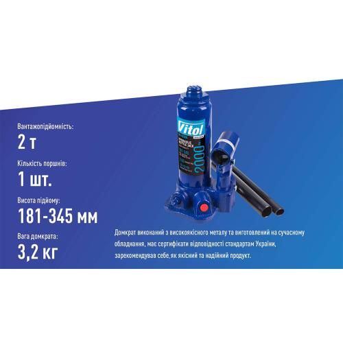 <p><span style="font-family: arial, helvetica, sans-serif; font-size: 14px;">20 років на ринку України та десятки тисяч задоволених клієнтів підтверджують якість та надійність товарів ТМ Вітол. Придбавши телескопічний гідравлічний домкрат </span><strong style="font-family: arial, helvetica, sans-serif; font-size: 14px;">ДБ-02006</strong><span style="font-family: arial, helvetica, sans-serif; font-size: 14px;">, ви будете готові до будь-яких викликів, які може кинути вам автомобільне життя.</span><br /><img src="https://vitol.com.ua/image/size-1/457854.png" /><br /><strong style="font-family: arial, helvetica, sans-serif; font-size: 14px;">Як вибрати модель домкрата, яка підійде Вашому автомобілю?</strong><br style="font-family: arial, helvetica, sans-serif; font-size: 14px;" /><span style="font-family: arial, helvetica, sans-serif; font-size: 14px;">Першочергова характеристика — </span><strong style="font-family: arial, helvetica, sans-serif; font-size: 14px;">грузопідйомність</strong><span style="font-family: arial, helvetica, sans-serif; font-size: 14px;"> домкрата, визначити яку можна додавши 300-400 кг до ваги Вашого авто.</span><br style="font-family: arial, helvetica, sans-serif; font-size: 14px;" /><span style="font-family: arial, helvetica, sans-serif; font-size: 14px;">Не менш важливим параметром є </span><strong style="font-family: arial, helvetica, sans-serif; font-size: 14px;">мінімальна</strong><span style="font-family: arial, helvetica, sans-serif; font-size: 14px;"> та </span><strong style="font-family: arial, helvetica, sans-serif; font-size: 14px;">максимальна висота підйому</strong><span style="font-family: arial, helvetica, sans-serif; font-size: 14px;"> домкрата. Для визначення </span><strong style="font-family: arial, helvetica, sans-serif; font-size: 14px;">мінімальної</strong><span style="font-family: arial, helvetica, sans-serif; font-size: 14px;"> висоти Вам потрібно виміряти кліренс Вашого автомобіля та відняти висоту шини, інакше при спущеному колесі буде неможливо встановити домкрат під автомобіль.</span><br style="font-family: arial, helvetica, sans-serif; font-size: 14px;" /><span style="font-family: arial, helvetica, sans-serif; font-size: 14px;">Для </span><strong style="font-family: arial, helvetica, sans-serif; font-size: 14px;">максимальної</strong><span style="font-family: arial, helvetica, sans-serif; font-size: 14px;"> точки підйому Вам потрібно враховувати, що під час підйому пружина підвіски опустить колесо, і якщо у Вас немає запасу підйому, Ви не зможете зняти колесо з автомобіля. Середні показники для легкових автомобілів становлять 350-380 мм, а для позашляховиків - 450-500 мм. Також, Ви можете виміряти висоту самостійно, піднявши автомобіль на домкраті.</span><br /><img src="https://vitol.com.ua/image/size-1/457849.png" /><br /><strong style="font-family: arial, helvetica, sans-serif; font-size: 14px;">Важливо!</strong><span style="font-family: arial, helvetica, sans-serif; font-size: 14px;"> Зберігати та перевозити гідравлічний домкрат можна лише у вертикальному положенні, щоб уникнути витікання робочої рідини та несправності.</span><br /><img src="https://vitol.com.ua/image/size-1/457852.png" /><br /><strong style="font-family: arial, helvetica, sans-serif; font-size: 14px;">Міць у ваших руках!</strong><br style="font-family: arial, helvetica, sans-serif; font-size: 14px;" /><span style="font-family: arial, helvetica, sans-serif; font-size: 14px;">Телескопічні домкрати поєднують у собі компактний розмір та велику грузопідйомність. Оптимальні розміри дозволять Вам зберегти місце в багажнику автомобіля та зручно розмістити домкрат навіть у невеликому гаражі.</span><br style="font-family: arial, helvetica, sans-serif; font-size: 14px;" /><span style="font-family: arial, helvetica, sans-serif; font-size: 14px;">Гідравлічний механізм забезпечує плавність та легкість процесу підйому та опускання вантажу. Домкрати з великою грузопідйомністю також широко використовуються при ремонтно-будівельних роботах.</span><br style="font-family: arial, helvetica, sans-serif; font-size: 14px;" /><span style="font-family: arial, helvetica, sans-serif; font-size: 14px;">Важливо пам'ятати про безпеку при використанні телескопічного домкрату. Захисний клапан запобігає перевищенню максимального допустимого тиску та грузопідйомності, забезпечуючи безпеку при підйомі важких вантажів.</span><br /><img src="https://vitol.com.ua/image/size-1/455742.png" /><br