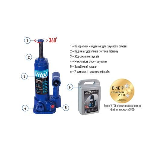 <p><span style="font-family: arial, helvetica, sans-serif; font-size: 14px;">20 років на ринку України та десятки тисяч задоволених клієнтів підтверджують якість та надійність товарів ТМ Вітол. Придбавши телескопічний гідравлічний домкрат </span><strong style="font-family: arial, helvetica, sans-serif; font-size: 14px;">ДБ-02006К</strong><span style="font-family: arial, helvetica, sans-serif; font-size: 14px;">, ви будете готові до будь-яких викликів, які може кинути вам автомобільне життя.</span><br /><img src="https://vitol.com.ua/image/size-1/457856.png" /><br /><strong style="font-family: arial, helvetica, sans-serif; font-size: 14px;">Як вибрати модель домкрата, яка підійде Вашому автомобілю?</strong><br style="font-family: arial, helvetica, sans-serif; font-size: 14px;" /><span style="font-family: arial, helvetica, sans-serif; font-size: 14px;">Першочергова характеристика — </span><strong style="font-family: arial, helvetica, sans-serif; font-size: 14px;">грузопідйомність</strong><span style="font-family: arial, helvetica, sans-serif; font-size: 14px;"> домкрата, визначити яку можна додавши 300-400 кг до ваги Вашого авто.</span><br style="font-family: arial, helvetica, sans-serif; font-size: 14px;" /><span style="font-family: arial, helvetica, sans-serif; font-size: 14px;">Не менш важливим параметром є </span><strong style="font-family: arial, helvetica, sans-serif; font-size: 14px;">мінімальна</strong><span style="font-family: arial, helvetica, sans-serif; font-size: 14px;"> та </span><strong style="font-family: arial, helvetica, sans-serif; font-size: 14px;">максимальна висота підйому</strong><span style="font-family: arial, helvetica, sans-serif; font-size: 14px;"> домкрата. Для визначення </span><strong style="font-family: arial, helvetica, sans-serif; font-size: 14px;">мінімальної</strong><span style="font-family: arial, helvetica, sans-serif; font-size: 14px;"> висоти Вам потрібно виміряти кліренс Вашого автомобіля та відняти висоту шини, інакше при спущеному колесі буде неможливо встановити домкрат під автомобіль.</span><br style="font-family: arial, helvetica, sans-serif; font-size: 14px;" /><span style="font-family: arial, helvetica, sans-serif; font-size: 14px;">Для </span><strong style="font-family: arial, helvetica, sans-serif; font-size: 14px;">максимальної</strong><span style="font-family: arial, helvetica, sans-serif; font-size: 14px;"> точки підйому Вам потрібно враховувати, що під час підйому пружина підвіски опустить колесо, і якщо у Вас немає запасу підйому, Ви не зможете зняти колесо з автомобіля. Середні показники для легкових автомобілів становлять 350-380 мм, а для позашляховиків - 450-500 мм. Також, Ви можете виміряти висоту самостійно, піднявши автомобіль на домкраті.</span><br /><img src="https://vitol.com.ua/image/size-1/455822.png" /><br /><strong style="font-family: arial, helvetica, sans-serif; font-size: 14px;">Важливо!</strong><span style="font-family: arial, helvetica, sans-serif; font-size: 14px;"> Зберігати та перевозити гідравлічний домкрат можна лише у вертикальному положенні, щоб уникнути витікання робочої рідини та несправності.</span><br /><img src="https://vitol.com.ua/image/size-1/455824.png" /><br /><strong style="font-family: arial, helvetica, sans-serif; font-size: 14px;">Міць у ваших руках!</strong><br style="font-family: arial, helvetica, sans-serif; font-size: 14px;" /><span style="font-family: arial, helvetica, sans-serif; font-size: 14px;">Телескопічні домкрати поєднують у собі компактний розмір та велику грузопідйомність. Оптимальні розміри дозволять Вам зберегти місце в багажнику автомобіля та зручно розмістити домкрат навіть у невеликому гаражі.</span><br style="font-family: arial, helvetica, sans-serif; font-size: 14px;" /><span style="font-family: arial, helvetica, sans-serif; font-size: 14px;">Гідравлічний механізм забезпечує плавність та легкість процесу підйому та опускання вантажу. Домкрати з великою грузопідйомністю також широко використовуються при ремонтно-будівельних роботах.</span><br style="font-family: arial, helvetica, sans-serif; font-size: 14px;" /><span style="font-family: arial, helvetica, sans-serif; font-size: 14px;">Важливо пам'ятати про безпеку при використанні телескопічного домкрату. Захисний клапан запобігає перевищенню максимального допустимого тиску та грузопідйомності, забезпечуючи безпеку при підйомі важких вантажів.</span><br /><img src="https://vitol.com.ua/image/size-1/455821.png" /><