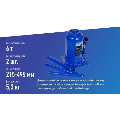 <p><span style="font-family: arial, helvetica, sans-serif; font-size: 14px;">20 років на ринку України та десятки тисяч задоволених клієнтів підтверджують якість та надійність товарів ТМ Вітол. Придбавши телескопічний гідравлічний домкрат </span><strong style="font-family: arial, helvetica, sans-serif; font-size: 14px;">ДБ-60002Ц</strong><span style="font-family: arial, helvetica, sans-serif; font-size: 14px;">, ви будете готові до будь-яких викликів, які може кинути вам автомобільне життя.</span><br /><img src="https://vitol.com.ua/image/size-1/456116.png" /><br /><strong style="font-family: arial, helvetica, sans-serif; font-size: 14px;">Як вибрати модель домкрата, яка підійде Вашому автомобілю?</strong><br style="font-family: arial, helvetica, sans-serif; font-size: 14px;" /><span style="font-family: arial, helvetica, sans-serif; font-size: 14px;">Першочергова характеристика — </span><strong style="font-family: arial, helvetica, sans-serif; font-size: 14px;">грузопідйомність </strong><span style="font-family: arial, helvetica, sans-serif; font-size: 14px;">домкрата, визначити яку можна додавши 300-400 кг до ваги Вашого авто.</span><br style="font-family: arial, helvetica, sans-serif; font-size: 14px;" /><span style="font-family: arial, helvetica, sans-serif; font-size: 14px;">Не менш важливим параметром є </span><strong style="font-family: arial, helvetica, sans-serif; font-size: 14px;">мінімальна </strong><span style="font-family: arial, helvetica, sans-serif; font-size: 14px;">та </span><strong style="font-family: arial, helvetica, sans-serif; font-size: 14px;">максимальна висота підйому</strong><span style="font-family: arial, helvetica, sans-serif; font-size: 14px;"> домкрата. Для визначення </span><strong style="font-family: arial, helvetica, sans-serif; font-size: 14px;">мінімальної</strong><span style="font-family: arial, helvetica, sans-serif; font-size: 14px;"> висоти Вам потрібно виміряти кліренс Вашого автомобіля та відняти висоту шини, інакше при спущеному колесі буде неможливо встановити домкрат під автомобіль.</span><br style="font-family: arial, helvetica, sans-serif; font-size: 14px;" /><span style="font-family: arial, helvetica, sans-serif; font-size: 14px;">Для </span><strong style="font-family: arial, helvetica, sans-serif; font-size: 14px;">максимальної </strong><span style="font-family: arial, helvetica, sans-serif; font-size: 14px;">точки підйому Вам потрібно враховувати, що під час підйому пружина підвіски опустить колесо, і якщо у Вас немає запасу підйому, Ви не зможете зняти колесо з автомобіля. Середні показники для легкових автомобілів становлять 350-380 мм, а для позашляховиків - 450-500 мм. Також, Ви можете виміряти висоту самостійно, піднявши автомобіль на домкраті.</span><br /><img src="https://vitol.com.ua/image/size-1/456114.png" /><br /><strong style="font-family: arial, helvetica, sans-serif; font-size: 14px;">Важливо!</strong><span style="font-family: arial, helvetica, sans-serif; font-size: 14px;"> Зберігати та перевозити гідравлічний домкрат можна лише у вертикальному положенні, щоб уникнути витікання робочої рідини та несправності.</span><br /><img src="https://vitol.com.ua/image/size-1/456122.png" /><br /><strong style="font-family: arial, helvetica, sans-serif; font-size: 14px;">Міць у ваших руках!</strong><br style="font-family: arial, helvetica, sans-serif; font-size: 14px;" /><span style="font-family: arial, helvetica, sans-serif; font-size: 14px;">Телескопічні домкрати поєднують у собі компактний розмір та велику грузопідйомність. Оптимальні розміри дозволять Вам зберегти місце в багажнику автомобіля та зручно розмістити домкрат навіть у невеликому гаражі.</span><br style="font-family: arial, helvetica, sans-serif; font-size: 14px;" /><span style="font-family: arial, helvetica, sans-serif; font-size: 14px;">Гідравлічний механізм забезпечує плавність та легкість процесу підйому та опускання вантажу. Домкрати з великою грузопідйомністю також широко використовуються при ремонтно-будівельних роботах.</span><br style="font-family: arial, helvetica, sans-serif; font-size: 14px;" /><span style="font-family: arial, helvetica, sans-serif; font-size: 14px;">Важливо пам'ятати про безпеку при використанні телескопічного домкрату. Захисний клапан запобігає перевищенню максимального допустимого тиску та грузопідйомності, забезпечуючи безпеку при підйомі важких вантажів.</span><br /><img src="https://vitol.com.ua/image/size-1/456120.png" /><