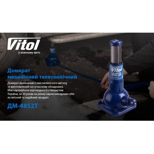 <p><span style="font-family: arial, helvetica, sans-serif; font-size: 14px;">20 років на ринку України та десятки тисяч задоволених клієнтів підтверджують якість та надійність товарів ТМ Вітол. Придбавши телескопічний механічний домкрат </span><strong style="font-family: arial, helvetica, sans-serif; font-size: 14px;">ДМ-4852Т</strong><span style="font-family: arial, helvetica, sans-serif; font-size: 14px;">, ви будете готові до будь-яких викликів, які може кинути вам автомобільне життя.</span><br /><img src="/image/size-1/456692.png" /><br /><strong style="font-family: arial, helvetica, sans-serif; font-size: 14px;">Як вибрати модель домкрата, яка підійде Вашому автомобілю?</strong><br style="font-family: arial, helvetica, sans-serif; font-size: 14px;" /><span style="font-family: arial, helvetica, sans-serif; font-size: 14px;">Першочергова характеристика — </span><strong style="font-family: arial, helvetica, sans-serif; font-size: 14px;">грузопідйомність</strong><span style="font-family: arial, helvetica, sans-serif; font-size: 14px;"> домкрата, визначити яку можна додавши 300-400 кг до ваги Вашого авто.</span><br style="font-family: arial, helvetica, sans-serif; font-size: 14px;" /><span style="font-family: arial, helvetica, sans-serif; font-size: 14px;">Не менш важливим параметром є </span><strong style="font-family: arial, helvetica, sans-serif; font-size: 14px;">мінімальна</strong><span style="font-family: arial, helvetica, sans-serif; font-size: 14px;"> та </span><strong style="font-family: arial, helvetica, sans-serif; font-size: 14px;">максимальна висота підйому</strong><span style="font-family: arial, helvetica, sans-serif; font-size: 14px;"> домкрата. Для визначення </span><strong style="font-family: arial, helvetica, sans-serif; font-size: 14px;">мінімальної</strong><span style="font-family: arial, helvetica, sans-serif; font-size: 14px;"> висоти Вам потрібно виміряти кліренс Вашого автомобіля та відняти висоту шини, інакше при спущеному колесі буде неможливо встановити домкрат під автомобіль.</span><br style="font-family: arial, helvetica, sans-serif; font-size: 14px;" /><span style="font-family: arial, helvetica, sans-serif; font-size: 14px;">Для </span><strong style="font-family: arial, helvetica, sans-serif; font-size: 14px;">максимальної</strong><span style="font-family: arial, helvetica, sans-serif; font-size: 14px;"> точки підйому Вам потрібно враховувати, що під час підйому пружина підвіски опустить колесо, і якщо у Вас немає запасу підйому, Ви не зможете зняти колесо з автомобіля. Середні показники для легкових автомобілів становлять 350-380 мм, а для позашляховиків - 450-500 мм. Також, Ви можете виміряти висоту самостійно, піднявши автомобіль на домкраті.</span><br /><img src="/image/size-1/456696.png" /><br /><img src="/image/size-1/456697.png" /><br /><strong style="font-family: arial, helvetica, sans-serif; font-size: 14px;">Міць у ваших руках!</strong><br style="font-family: arial, helvetica, sans-serif; font-size: 14px;" /><span style="font-size: 14px;"><span style="font-family: arial, helvetica, sans-serif;">Простота використання та надійність механічної системи - головні відмінні риси даного домкрата. Крім того, механічні домкрати не потребують складного обслуговування або спеціальних знань для їх використання, що робить їх доступними та зручними для широкого кола споживачів. А оптимальний розмір даного домкрата дозволить вам зберегти місце у багажнику або комфортно розмістити його в гаражі.<br />Міцний, надійний та зручний у використанні телескопічний домкрат є одним з кращих механізмів, які дозволяють здійснювати заміну коліс легкових автомобілів на дорозі, у гаражі та в будь-яких, навіть найскладніших, полевих умовах.</span></span><br /><img src="/image/size-1/456698.png" /><br /><span style="font-size: 14px;"><span style="font-family: arial, helvetica, sans-serif;"><strong>1. Гвинтова система підйому<br />2. Зручна ручка з обертовою насадкою<br />3. Можливість використання шуруповерта </strong><br />прискорить підйом до максимуму</span></span><br /><br /><span style="font-family: arial, helvetica, sans-serif; font-size: 14px;">Домкрати ТМ Витол відрізняються високою міцністю та довговічністю. Корпус виготовлений зі сплаву, основною складовою якого є конструкційна вуглецева сталь марки </span><strong style="font-family: arial, helvetica, 