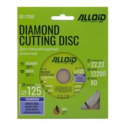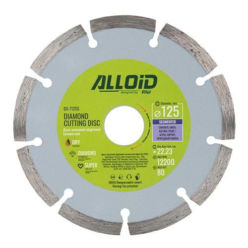 <p style="text-align: justify;"><span style="white-space-collapse: preserve;">Диск Alloid </span>DS-7125S <span style="white-space-collapse: preserve;">з сегментами, діаметром 125 мм і посадковим отвором 22,23 мм. Диск має високі технічні характеристики і призначений для щоденного професійного використання у сфері будівництва та ремонтних робіт.</span></p><p style="text-align: justify;"><img src="https://vitol.com.ua/image/size-1/458502.png" /></p><p style="text-align: justify;"><span style="white-space-collapse: preserve;">Диск Alloid </span>DS-7125S<span style="white-space-collapse: preserve;"> з сегментами від Alloid є високопрофесійним інструментом. Диск виготовлений з високоякісного сплаву, що гарантує йому надзвичайну міцність та довговічність.</span></p><p style="text-align: justify;"><img src="https://vitol.com.ua/image/size-1/458501.png" /><br /><span style="white-space-collapse: preserve;"><strong>ПЕРЕВАГИ АЛМАЗНОГО ДИСКУ Alloid </strong></span><strong>DS-7125S</strong><span style="white-space-collapse: preserve;"><strong>:</strong><br />Висока міцність: ріжучий шар приварений до металевої основи диска методом вварювання алмазного шару, виключає порушення цілісності диска при тривалій і інтенсивній роботі. Цим самим забезпечується надзвичайна якість та довговічність роботи диска.<br />Самоохолодження: вирізи, що розділяють диск на сегменти, мають спеціальну клиноподібну форму для найкращого охолодження диска і, тим самим, збільшують безперервний час роботи диска в рази.<br />Іде</span><span style="white-space-collapse: preserve;">альне балансування: за рахунок високоякісних матеріалів, досконалої форми та точно відцентрованої посадки на електроінструмент, диск має ідеальне балансування.</span></p><p style="text-align: justify;"><img src="https://vitol.com.ua/image/size-1/458503.png" /></p><p style="text-align: justify;"><span style="white-space-collapse: preserve;">Диск алмазний відрізний сегментний Alloid </span>DS-7125S<span style="text-align: justify; white-space-collapse: preserve;"> </span><span style="white-space-collapse: preserve;">призначений для сухої різки таких матералів як бетон, цегла, тверді та м’які породи каменю, бруківка.</span></p><p style="text-align: justify;"><img src="https://vitol.com.ua/image/size-1/458181.png" /><br /><span style="white-space-collapse: preserve;">Завдяки простоті та унверсальності використання алмазний відрізний диск Alloid </span>DS-7125S<span style="white-space-collapse: preserve;"> підходить як для побутового, так і для професійного використання.</span></p><p style="text-align: justify;"><img src="https://vitol.com.ua/image/size-1/458184.png" /></p><p style="text-align: justify;"><strong><span style="white-space-collapse: preserve;">ALLOID - ІНСТРУМЕНТ ДЛЯ УКРАЇНСЬКИХ МАЙСТРІВ</span></strong></p><p style="text-align: justify;"><span style="white-space-collapse: preserve;">Компанія Vitol має великий досвід роботи з професійним інструментом відомих брендів, тому добре розуміє потреби споживачів у різних сферах діяльності. Спираючись саме на потребу та запит наших клієнтів, більш ніж 10 років тому виникла ідея створення власної торгової марки інструменту, яку невдовзі було втілено в лінійці інструменту на ім’я Alloid.</span></p><p style="text-align: justify;"><img src="https://vitol.com.ua/image/size-1/458178.png" /></p><p style="text-align: justify;"><span style="white-space-collapse: preserve;">Першочерговою концепцією бренду Alloid було створення якісного й доступного продукту для побутового використання. Вийшовши на ринок, завдяки своїй якості та характеристикам інструмент Alloid одразу ж здобув популярність не тільки серед майстрів-аматорів, а також й серед професіоналів. Від наших клієнтів, що мали змогу оцінити якість Alloid, почали надходити запити на спеціалізований професійний інструмент та обладнання. Тоді, щоб задовільнити цю потребу, асортимент Alloid було доповнено лінійкою спецінструменту та обладнання для СТО.<br />Наразі інструмент Alloid активно використовується майстрами на професійних СТО, у промисловості та виробництві, у будівництві т