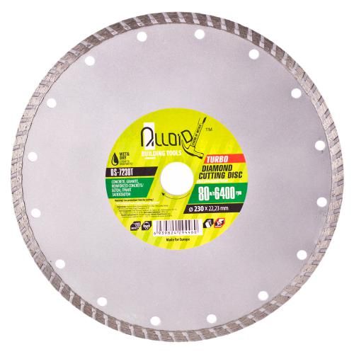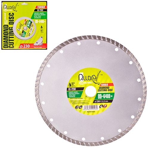 Диск алмазный отрезной Turbo Alloid DS-7180TALLoid DS-7230T TURBO, диск с высококачественным алмазным слоем. Диск имеет диаметр 230 мм, посадочное отверстие 22,23 мм, и рабочие обороты 8500 prm или 80 метров в секунду. Алмазный диск DS-7230T относится к линейке TURBO дисков, которые еще более устойчивы к делительной работе и не боятся значительных нагрузок. Диск Alloid DS-7230T используется для сухой резки. Обработанный спектр материалов достаточно широк и охватывает не только бетон, но и камень высокой плотности, и также разный кирпич.