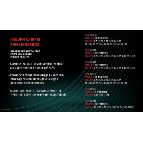 <p>Набір <strong>HANS 166326M</strong> складається з 26-и комбінованих вигнутих ключів 6-32 мм для загвинчування і відгвинчування різьбових з'єднань, що мають зовнішній профіль.</p><p>Конструкція кожного ключа включає дві головки: ріжкову і накидну. Ключі зроблені з високоякісної легованої хромованадієвої сталі. Інструмент здатний витримати високі навантаження. Завдяки дзеркально відполірованої поверхні ключі легко очистити після проведення робіт.</p><p>Дванадцятигранний профіль накидних головок забезпечує роботу як з 6-ти, так і з 12-гранними кріпильними елементами.</p><p>Набір відрізняється компактністю - весь вміст зберігається в зручному чохлі з тканини.</p><p><strong>Hans Tools</strong> - це всесвітньо відомий бренд професійних інструментів, який базується в Тайвані. Вся продукція <strong>Hans Tools</strong> виконана з високоякісних матеріалів і проходить суворий контроль якості.</p><div style="position:relative;padding-bottom:56.25%;padding-top:30px;height:0;overflow:hidden;"><iframe allowfullscreen="" frameborder="0" height="360" src="https://www.youtube.com/embed/VxA171EEpFk" style="position: absolute;top: 0;left: 0;width: 100%;height: 100%;" width="640"></iframe></div><p> </p>