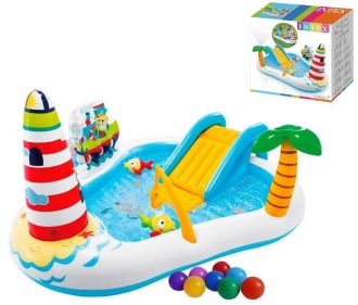 Intex Игральный центр 57162 NP "Веселая рыбалка" (2) для детей от 3 лет, с распылителем, горкой, шариками, размер 218 х 188 х 99 см, с надувной удочкой, 2 рыбы.