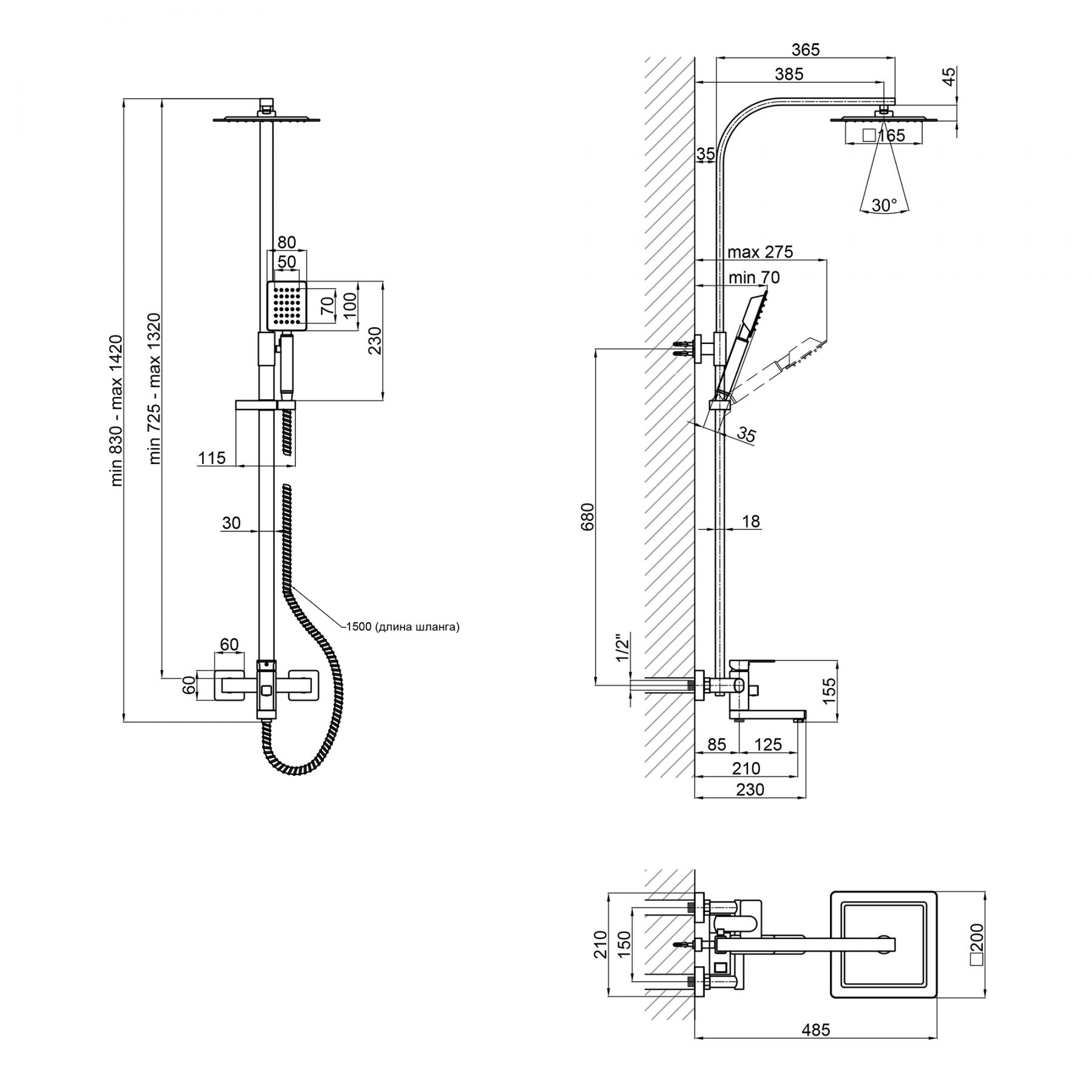 Диаметр лейки, мм:Ручной душ 80х100. Верхний душ: 200х200