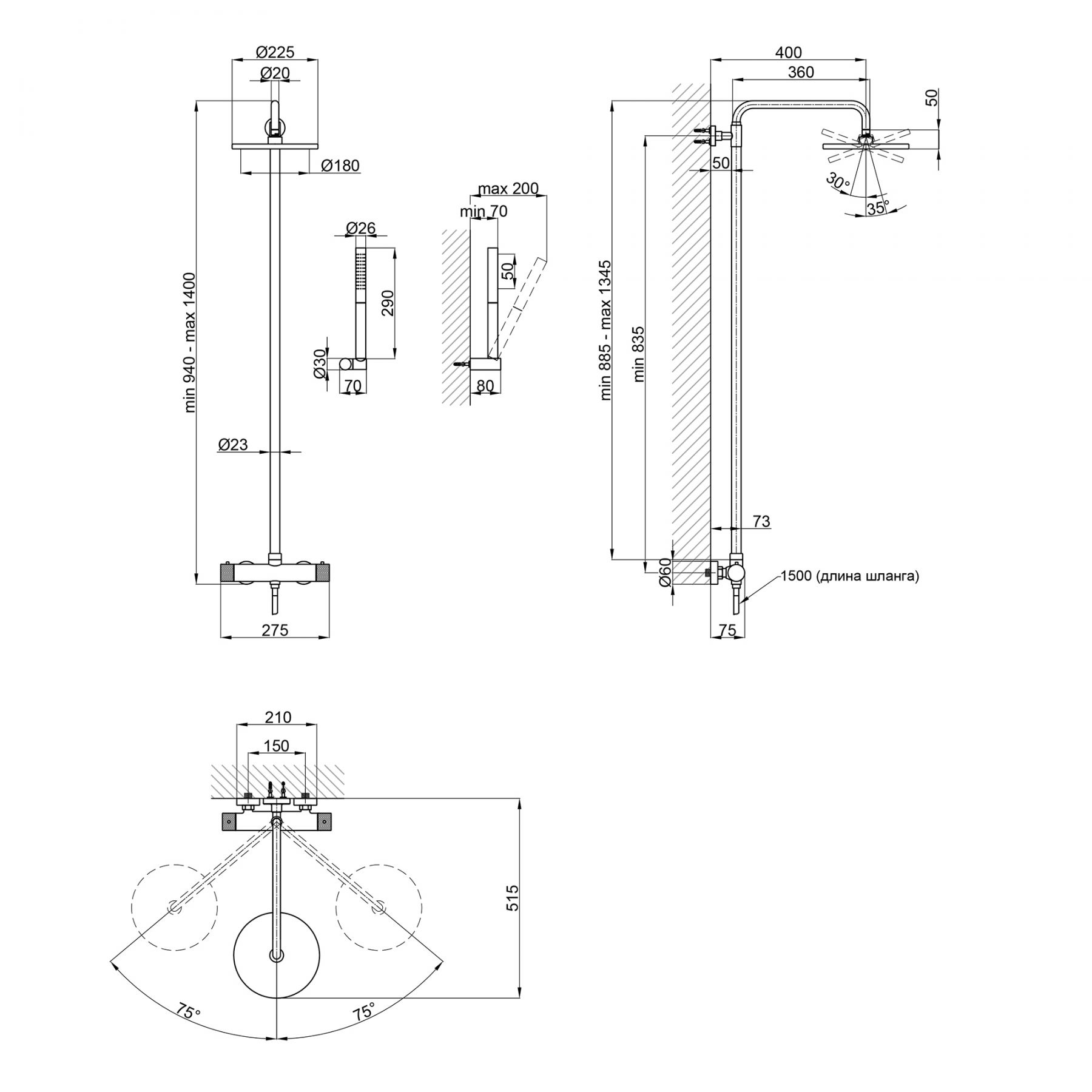 Диаметр лейки, мм:Ручной душ 32х50. Верхний душ: 225