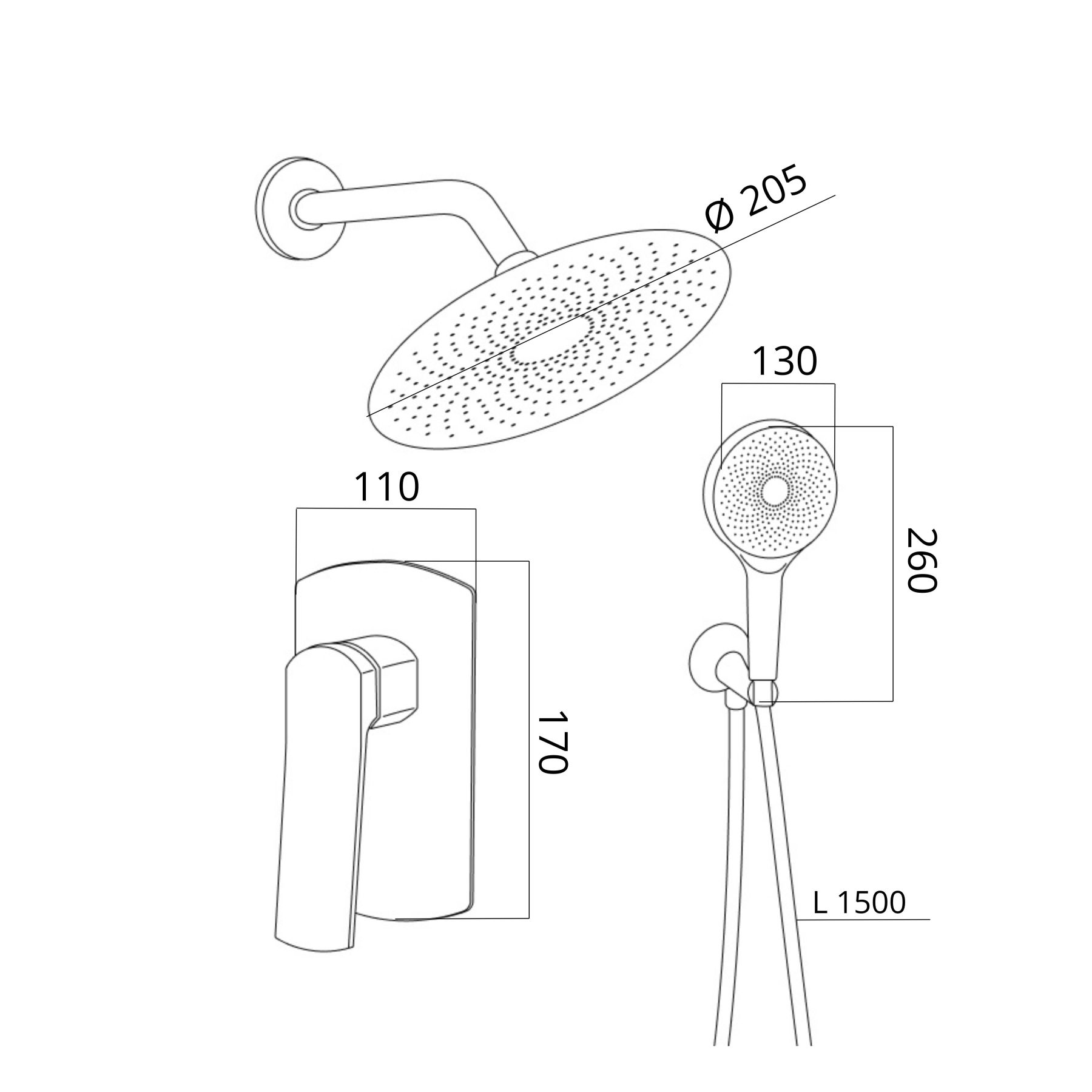 Габаритные размеры изделия (ШхГхВ), мм:Лійка верхнього душу: 205х205х50; ручна лійка: 130х50х260; змішувач: 110х30х170