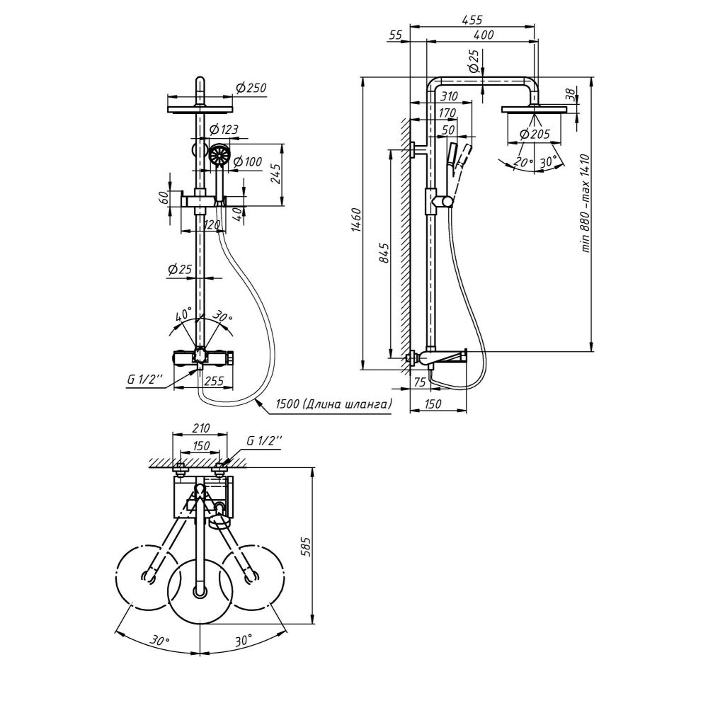 Высота душевой стойки, мм:880-1410