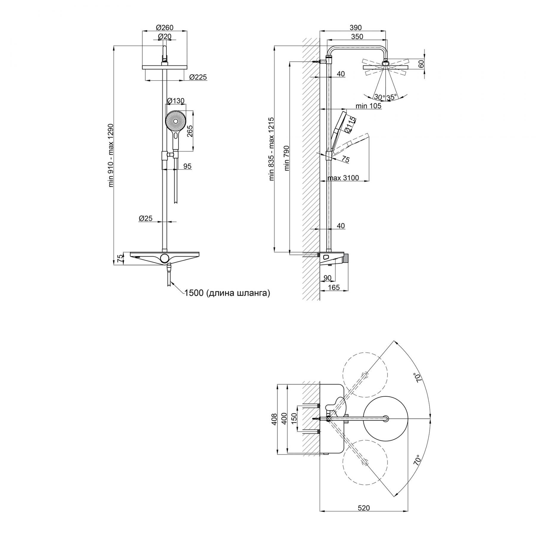 Диаметр лейки, мм:Ручной душ: 130. Верхний душ: 260