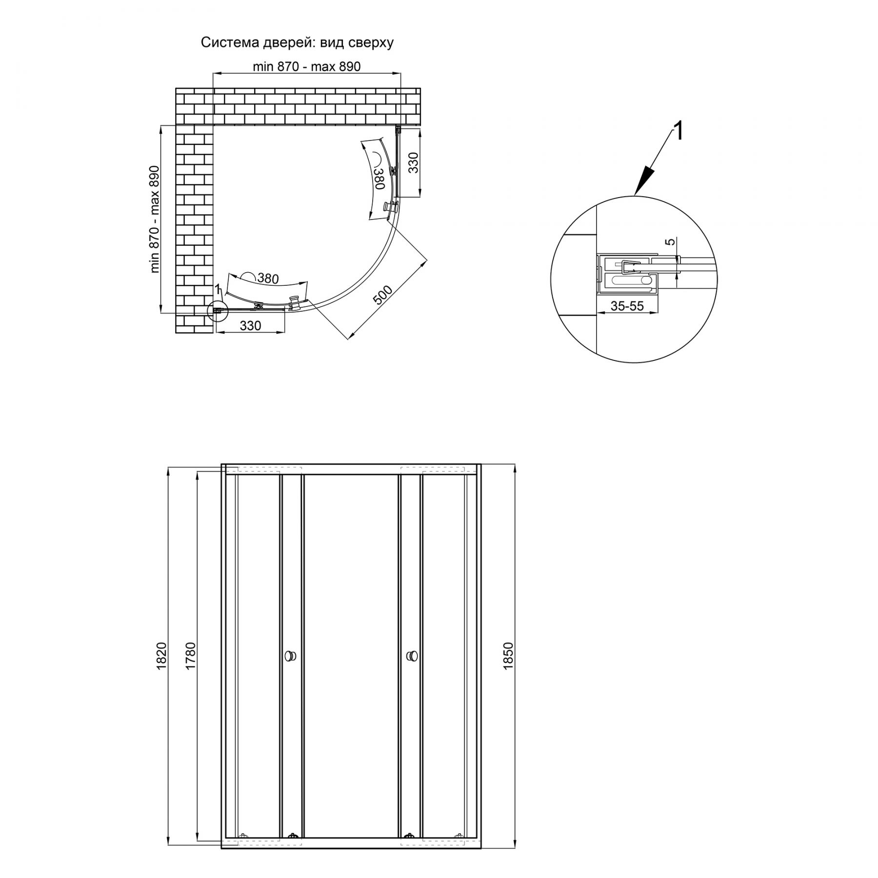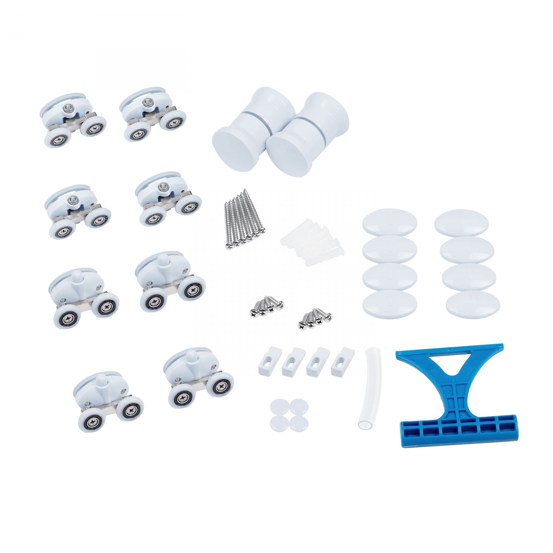 Комплектация:Двойные ролики, ручки, верхний профиль, нижний профиль, боковые профили, набор уплотнителей, расширительные профили, 2 стеклянных дверей, 2 глухих стекла, комплект крепежных деталей, заглушки, соединительные элементы, фиксаторы.
