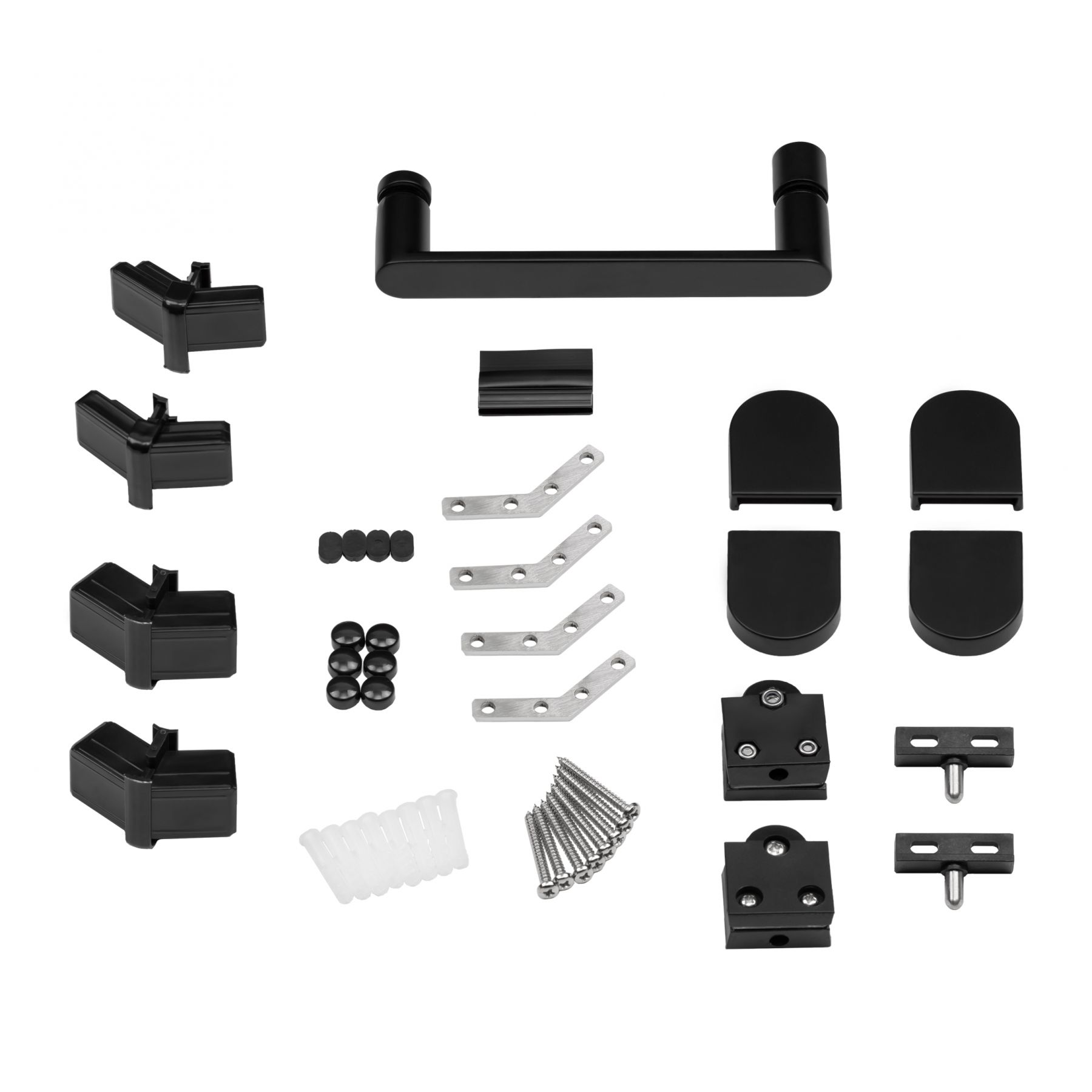 Комплектация:Верхний профиль, нижний профиль, боковые профили, расширительные профили, петли, держатели стекла, комплект крепежных деталей, заглушки, ручка, уплотнительный набор, глухое стекло, стеклянная дверь.