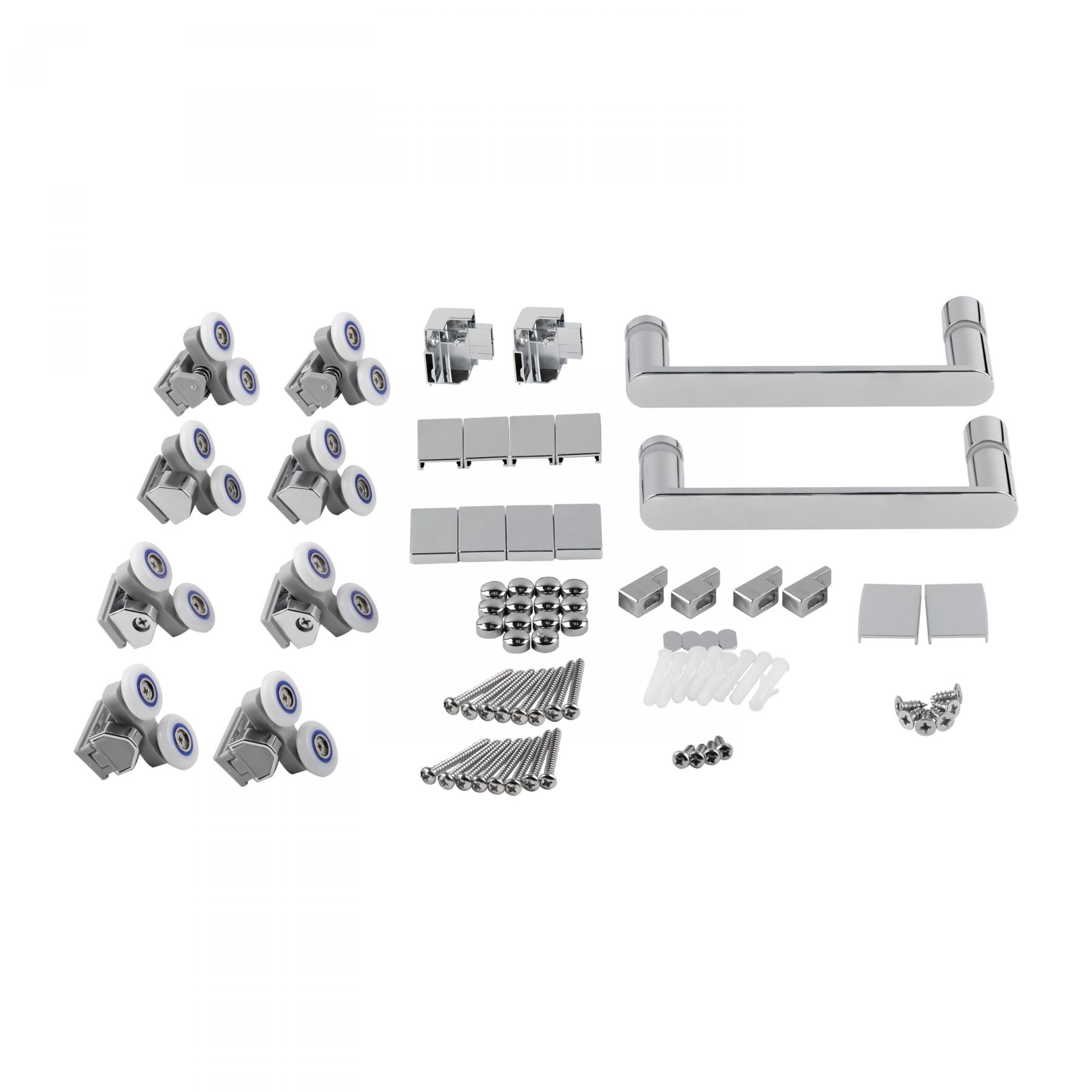 Комплектация:Двойные ролики, ручки, верхний профиль, нижний профиль, боковые профили, набор уплотнителей, расширительные профили, 2 стеклянных дверей, 2 глухих стекла, комплект крепежных деталей, заглушки, соединительные элементы, фиксаторы.