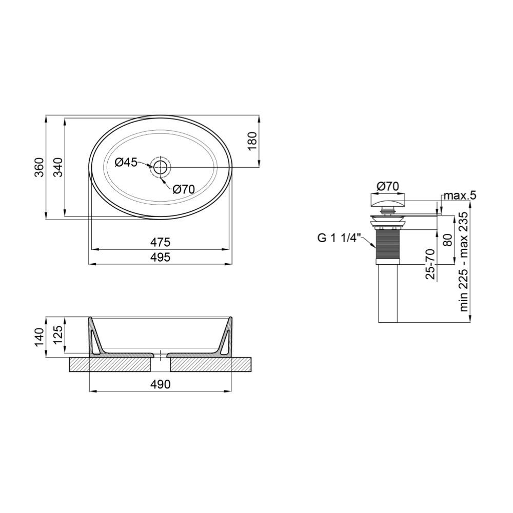 Габаритные размеры изделия (ШхГхВ), мм:495х360х140 – раковина; 70х70х225 - донний клапан