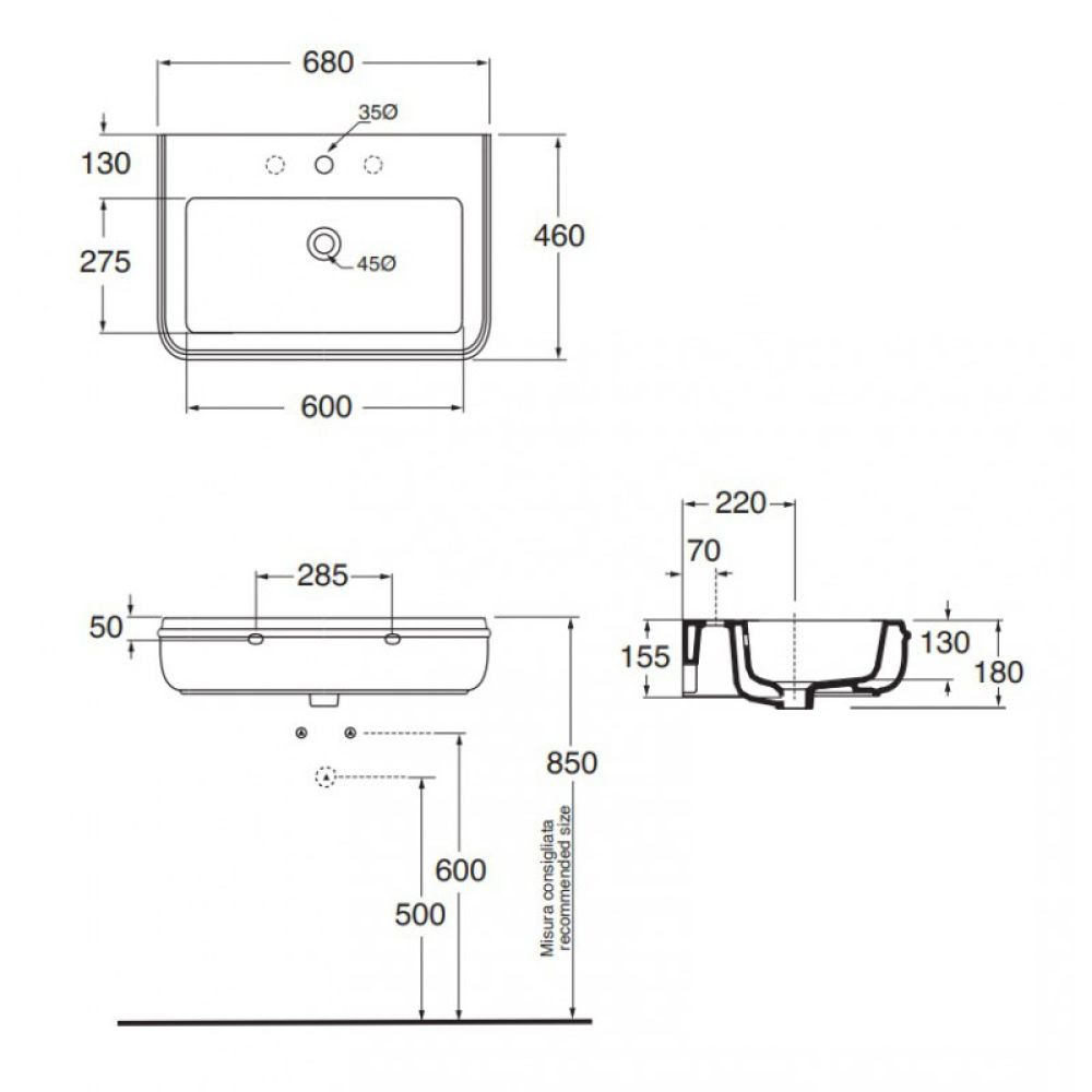 - Раковина имеет отверстие для смесителя и перелива.