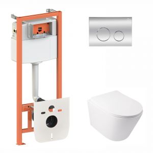 - Комплектуется унитазом, сиденьем, установочной рамой, панелью смыва и звукоизоляционной прокладкой.