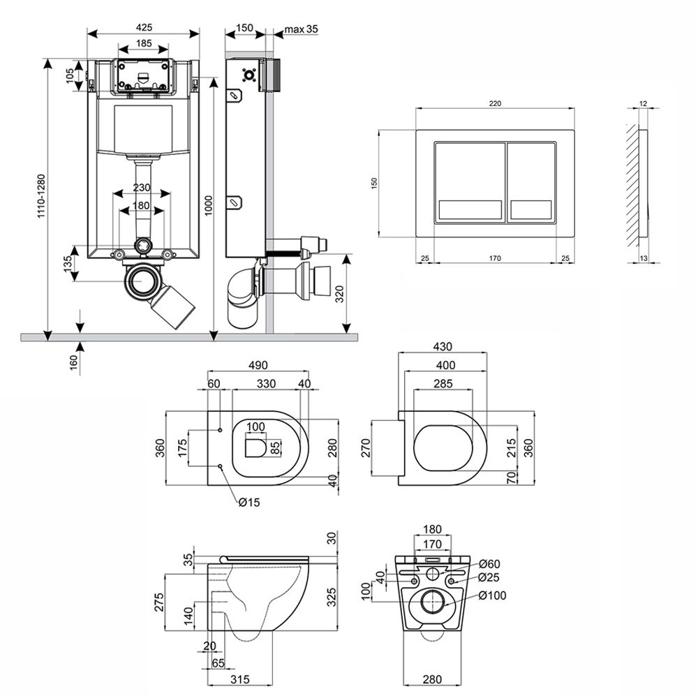 Габариты изделий (ВхШхД), мм:Унитаз: 325х360х490. Сидения: 35х360х430. Инсталляция: 1280х425х235. Панель смыва: 150х220х13.