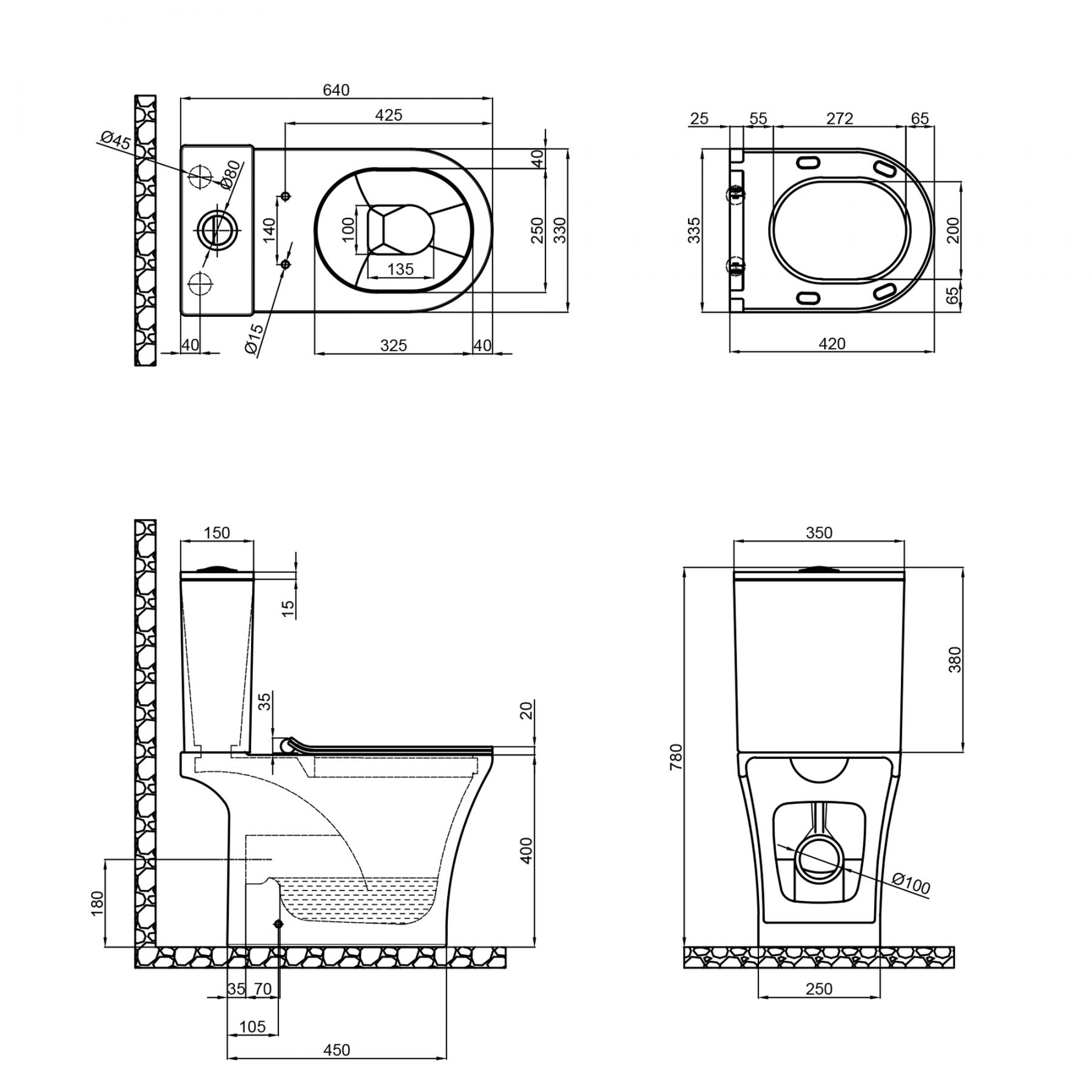 Габариты изделия (ВхШхГ), мм:Унитаз: 400х335х640. Сидения для унитаза: 35х335х420. Бачок: 380х350х150.