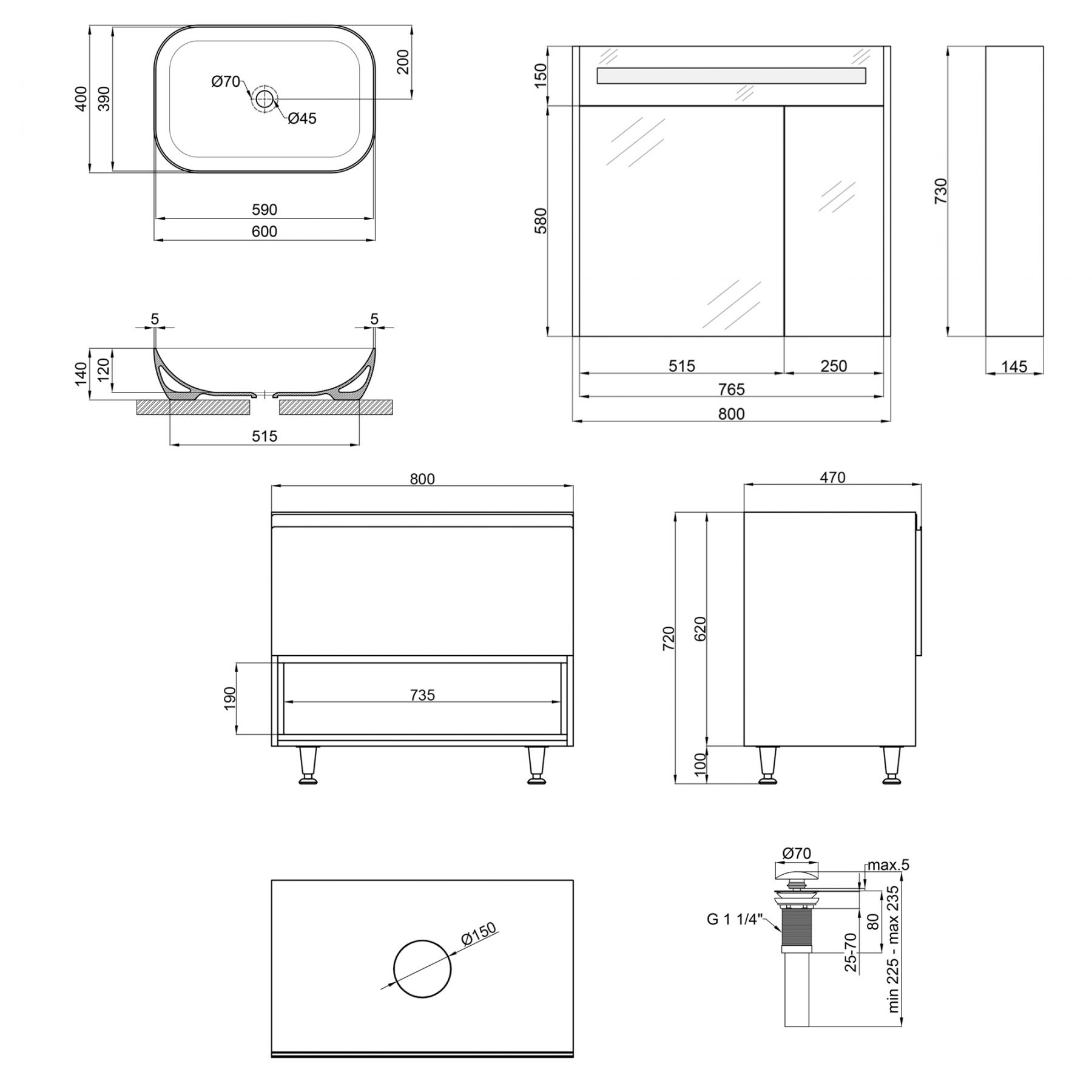 Состав набора:Тумба под раковину + зеркальный шкаф + раковина