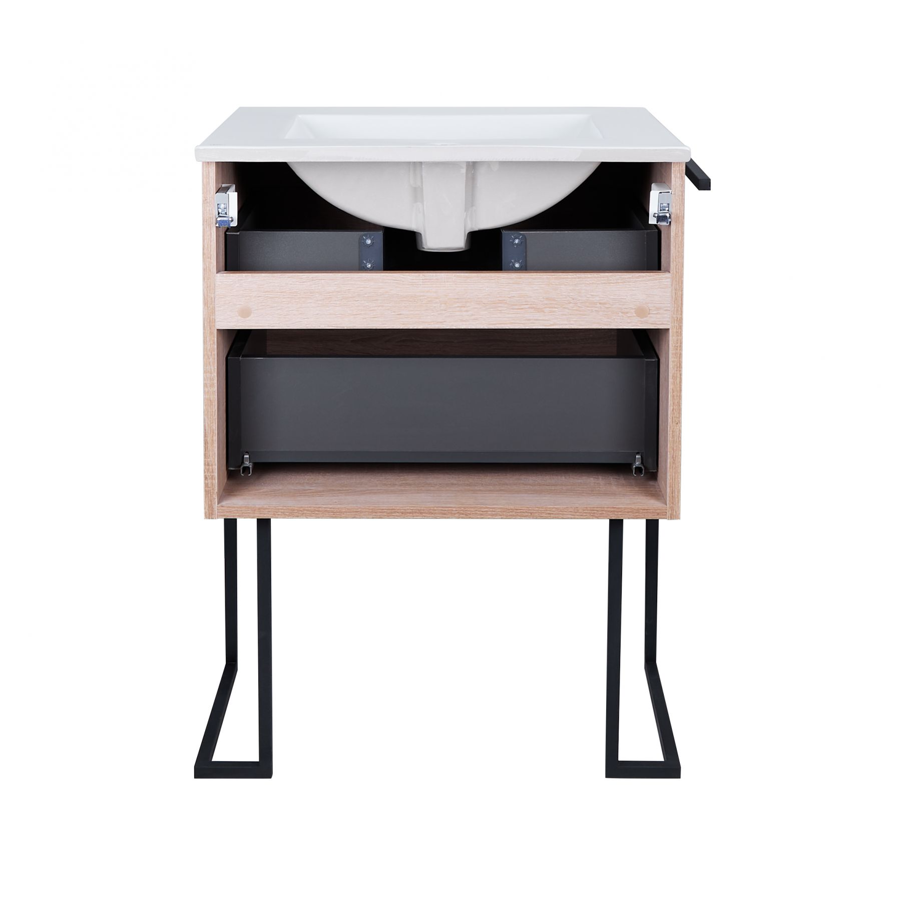 Комплектация:Тумба, раковина, донный клапан, крепежные детали. Металлический каркас, ручки и держатель для полотенец изготовлены из стали.
