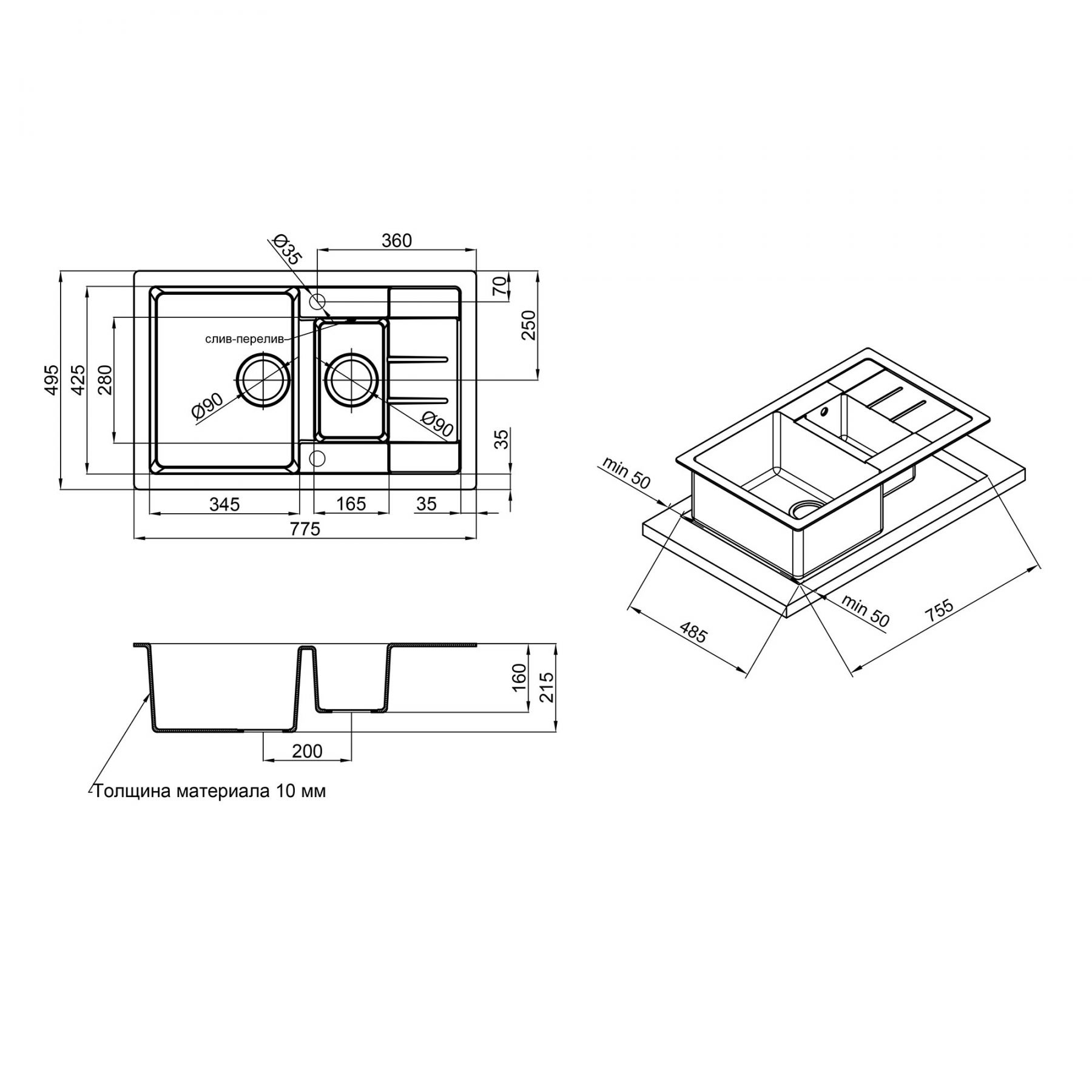 Кухонная мойка с дополнительной чашей Lidz 780x495/200 BLA-03 (LIDZBLA03780495200)