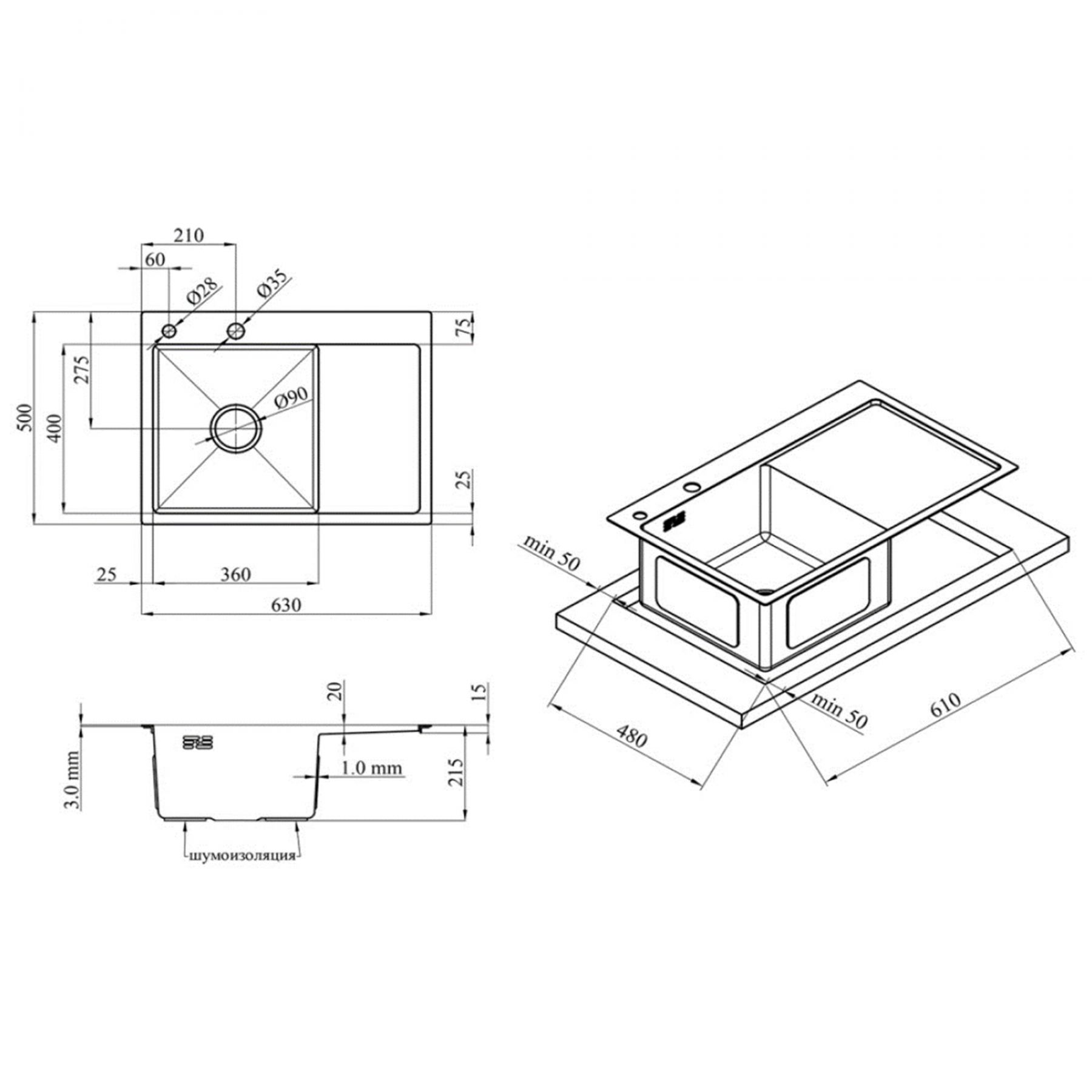 Мойка для кухни интегрированная Lidz Handmade H6350BR крыло справа (LDH6350BRPVD45590) Brushed Black PVD 3,0/1,0 мм