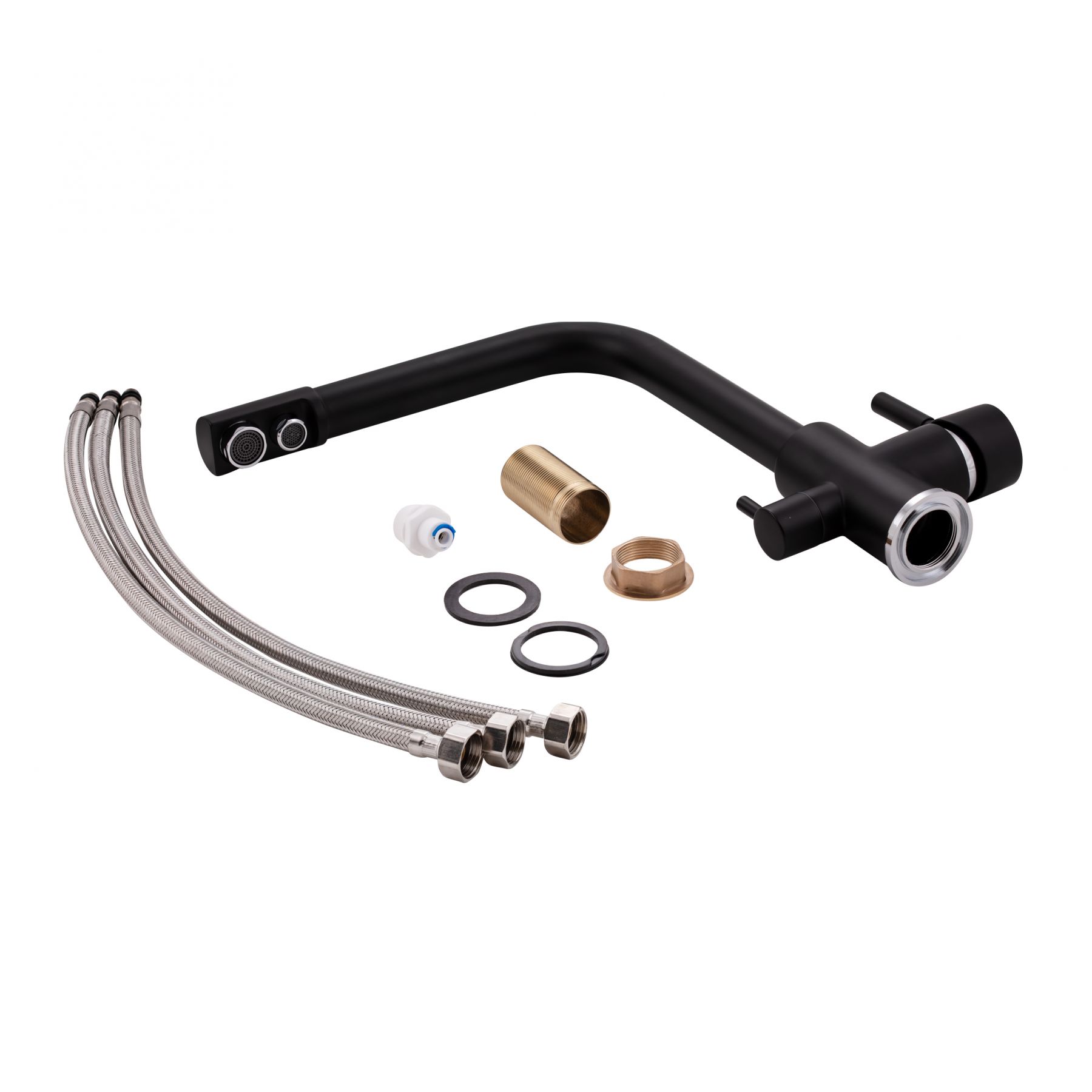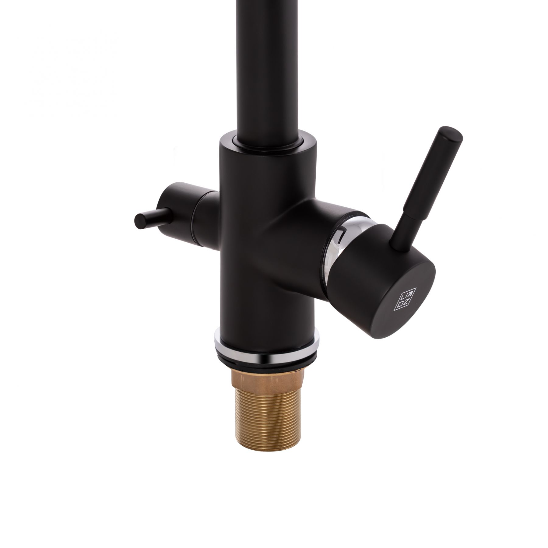 Смеситель для кухни с фильтром Lidz (BLA) Over 38020 изготовлен из высококачественной латуни. Благодаря матовой черной поверхности имеет оригинальный внешний вид. Выполнен в современном сдержанном стиле. В изделии предусмотрено 2 излияния: под воду для бытовых расходов и с фильтром для питьевой воды. Такой смеситель имеет дополнительный рычаг, позволяющий переключать режим подачи питьевой воды. Он не только удобен и практичен, но и станет идеальной находкой на кухне.