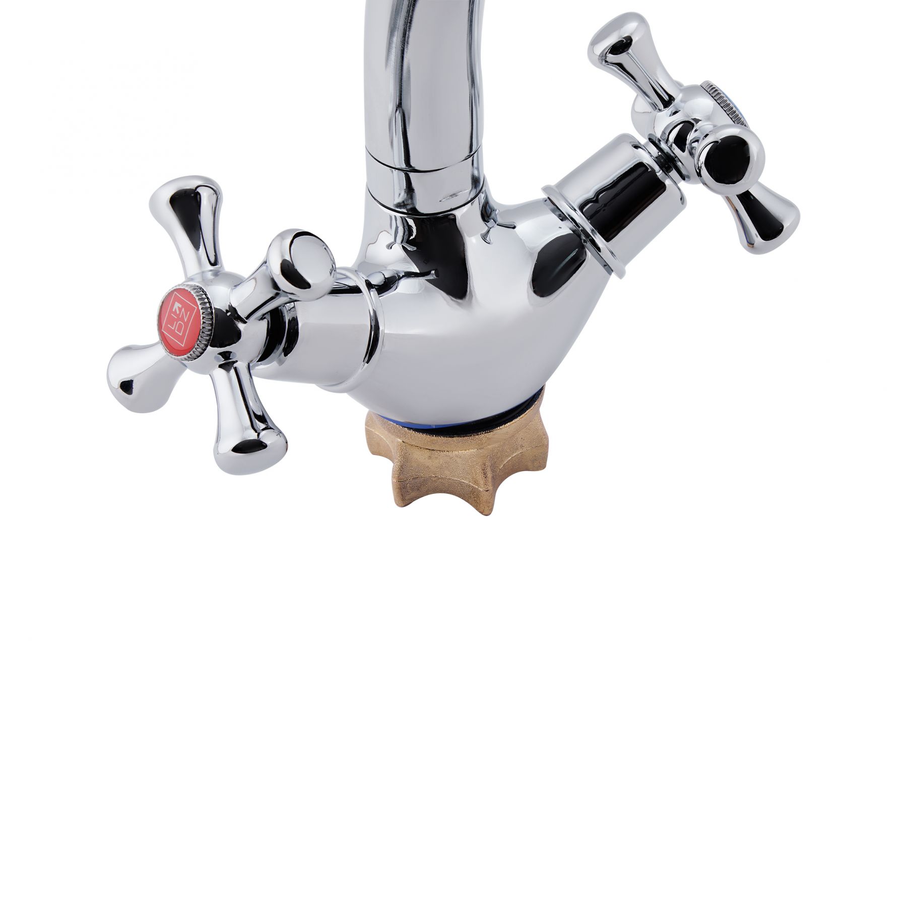 Смеситель для кухни Lidz (CRM) 75 21 271F-3 изготовлен из цинка. Благодаря глянцевому хромированному покрытию имеет оригинальный внешний вид. Выполнен в классическом стиле с вентильными ручками для переключения потока холодной и горячей воды.