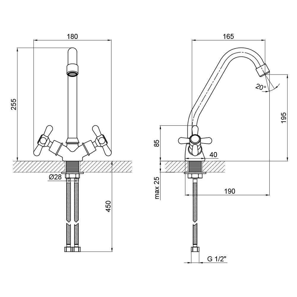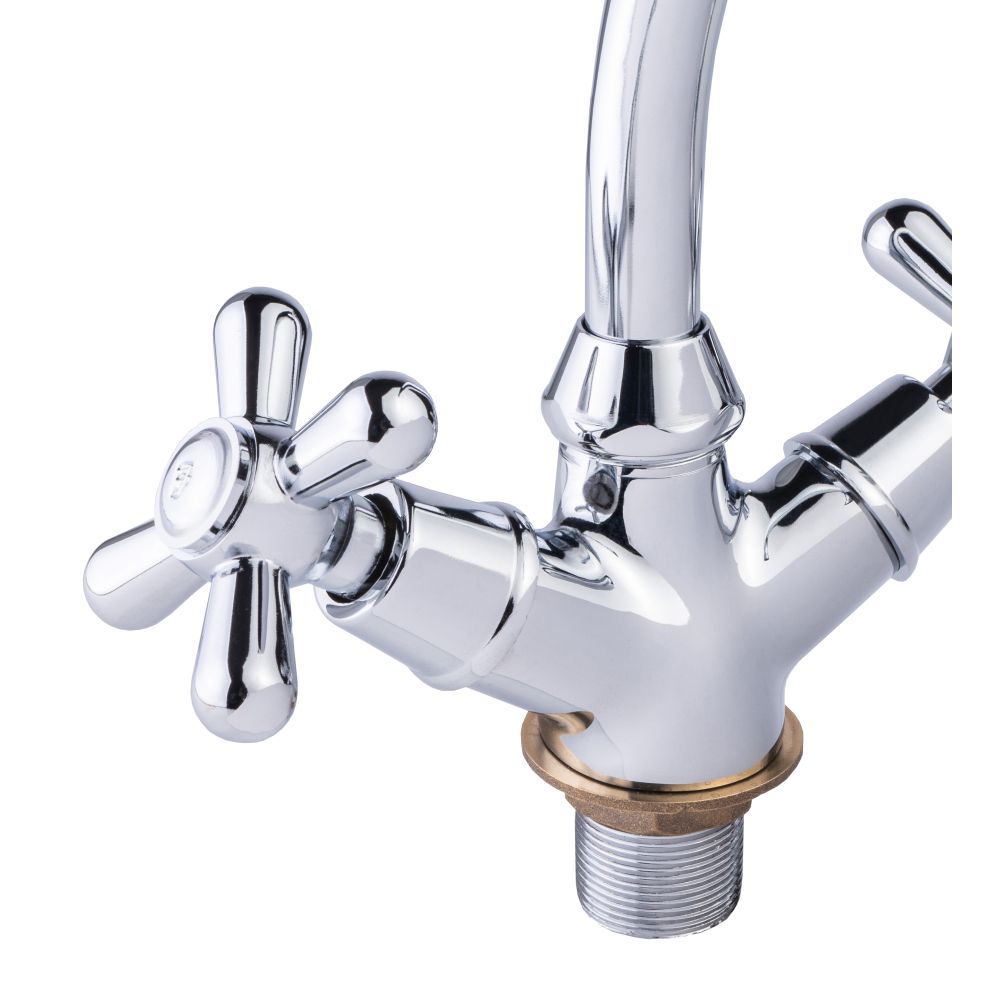 Смеситель Lidz (CRM) Dominox 15 272FK-1 будет выглядеть эстетично и подойдет под любой интерьер комнаты благодаря глянцевой блестящей поверхности. Он изготовлен из высококачественной латуни. Изделие монтируется в отверстие для смесителя на столешнице или кухонной мойке врезным способом. Напор воды и ее температура регулируются поворотом двух удобных вентилей в требуемое положение.