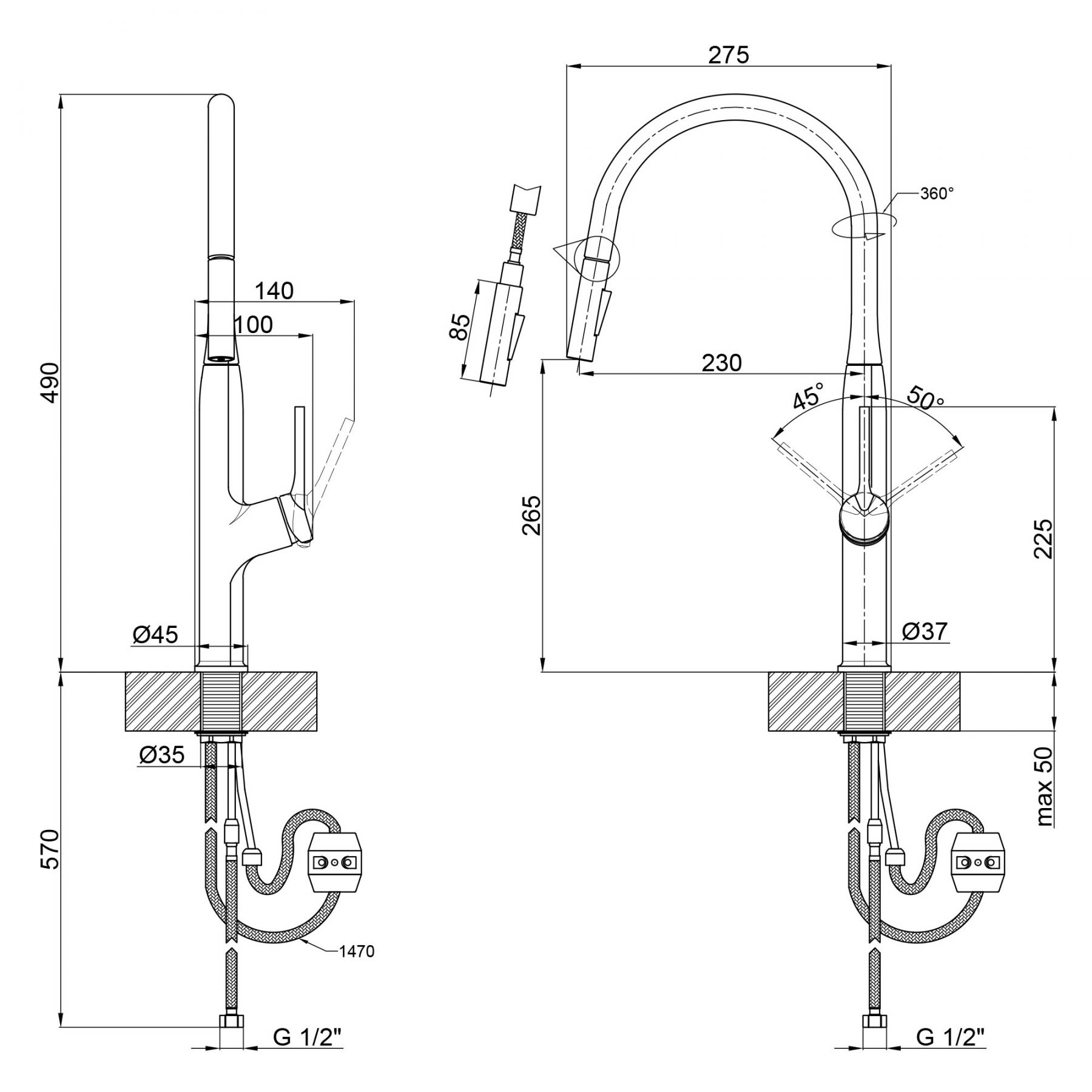 Дополнительные характеристики:Длина выдвижного шланга – 1470 мм. Длина гибкого подвода – 570 мм.