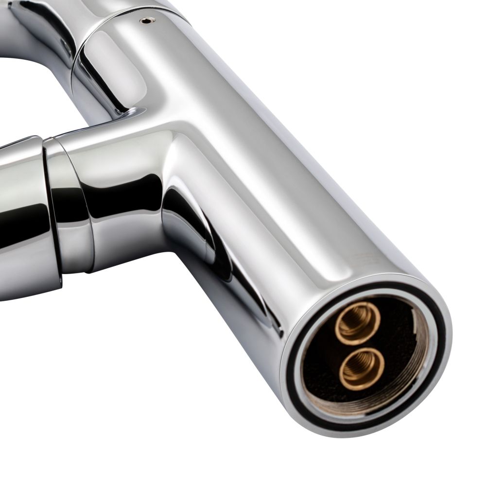 Смеситель для кухни с рефлекторным изливом Qtap Kuchyne 91107AC изготовлен из высококачественной пищевой латуни, не подверженной коррозии, устойчива к ударам и появлению трещин. Глянцевое хромированное покрытие не только повышает долговечность смесителя, но и придает ему привлекательность. Смеситель имеет однорычажное управление, с помощью которого можно отрегулировать температуру и давление холодной и горячей воды. Изделие выполнено в современном стиле, с рефлекторным изливом.