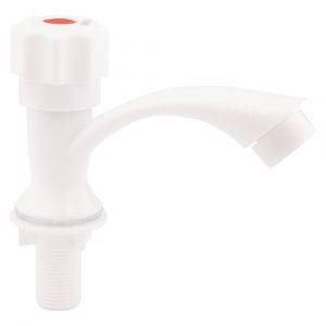 Кран на воду для раковины Brinex BW 0221 изготовлен из термопластического пластика белого цвета, что позволяет избежать коррозионных процессов. Изделие имеет лаконичный и практичный внешний вид.