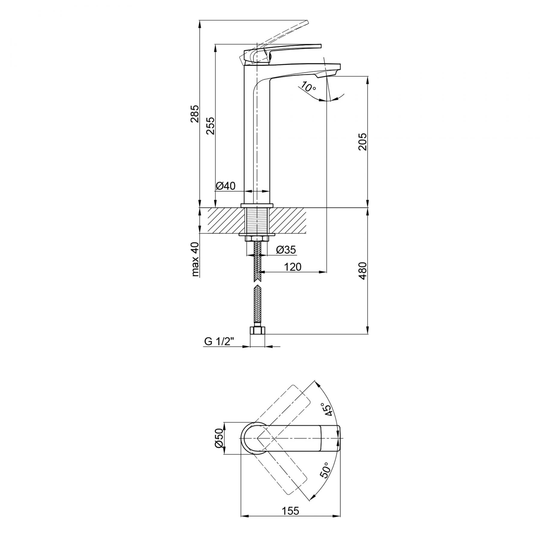 Длина излива, мм:120