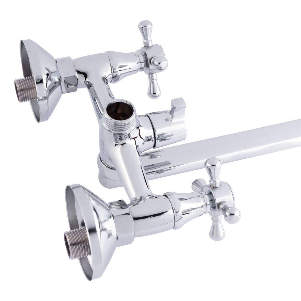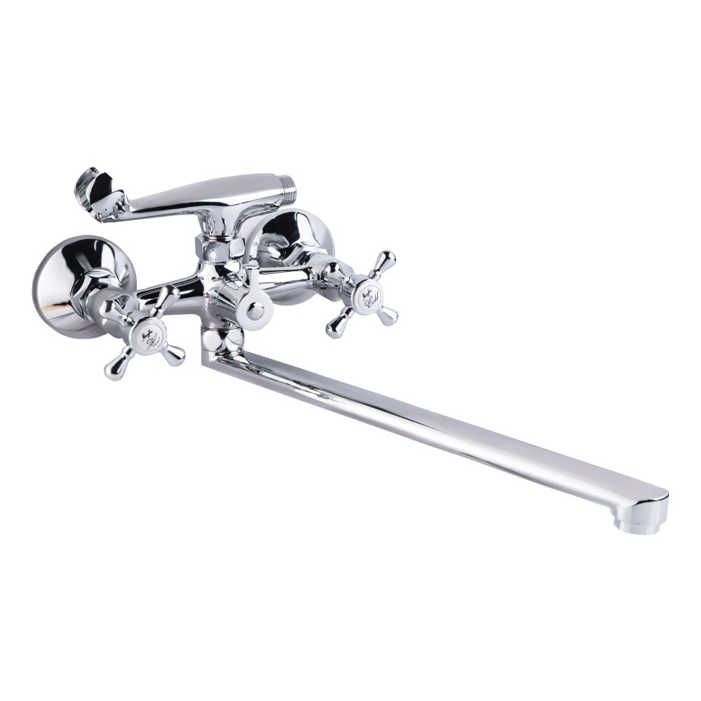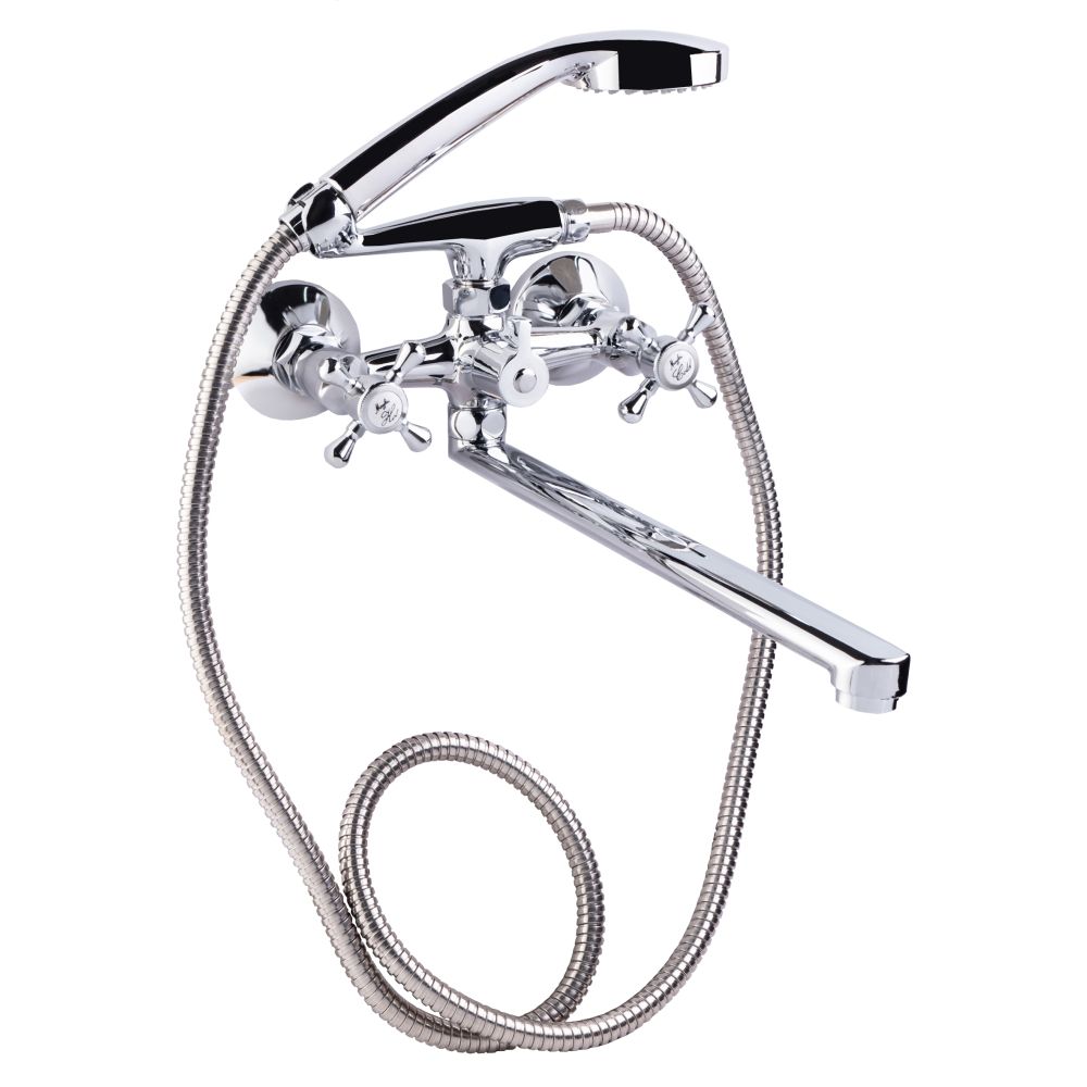 Смеситель для ванны Lidz (CRM) Mayfair 16 140 выполнен из глянцевой блестящей поверхности. Он устанавливается на стену над ванной. Круглые декоративные розетки скрывают погрешности установки на отделке комнаты. Напор воды и ее температура регулируются поворотом удобных ручек в нужное положение. Для удобства на него нанесена маркировка Х+Г воды. Переключение ванны/душ осуществляется поворотом дивертора.