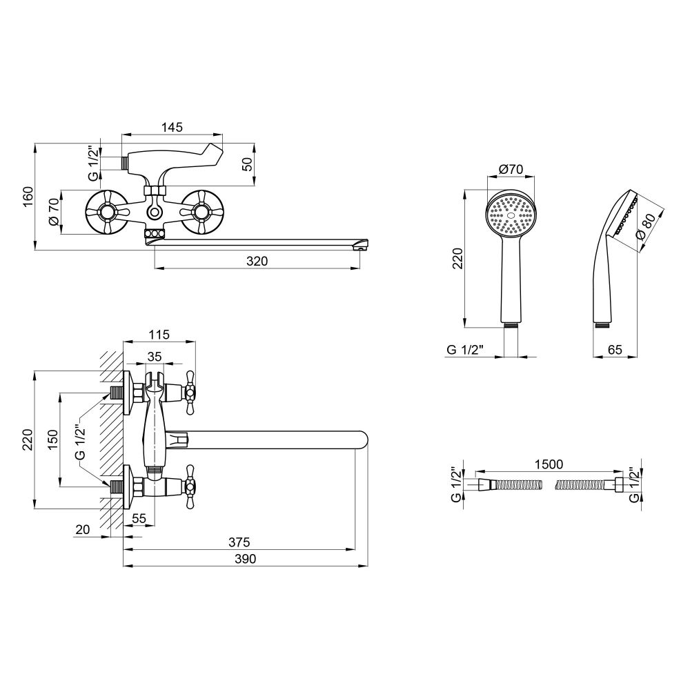 Дополнительные характеристики:Габариты лейки для ручного душа: 220х80х65. Длина душевого шланга – 1500 мм.