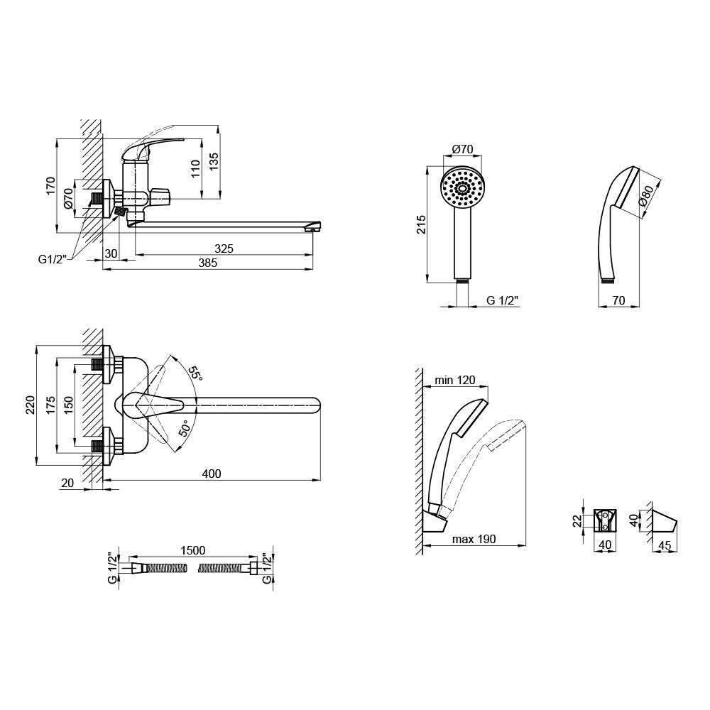 Комплектация:Смеситель. лейка для ручного душа. душевой шланг. держатель для ручного душа. крепежные детали.