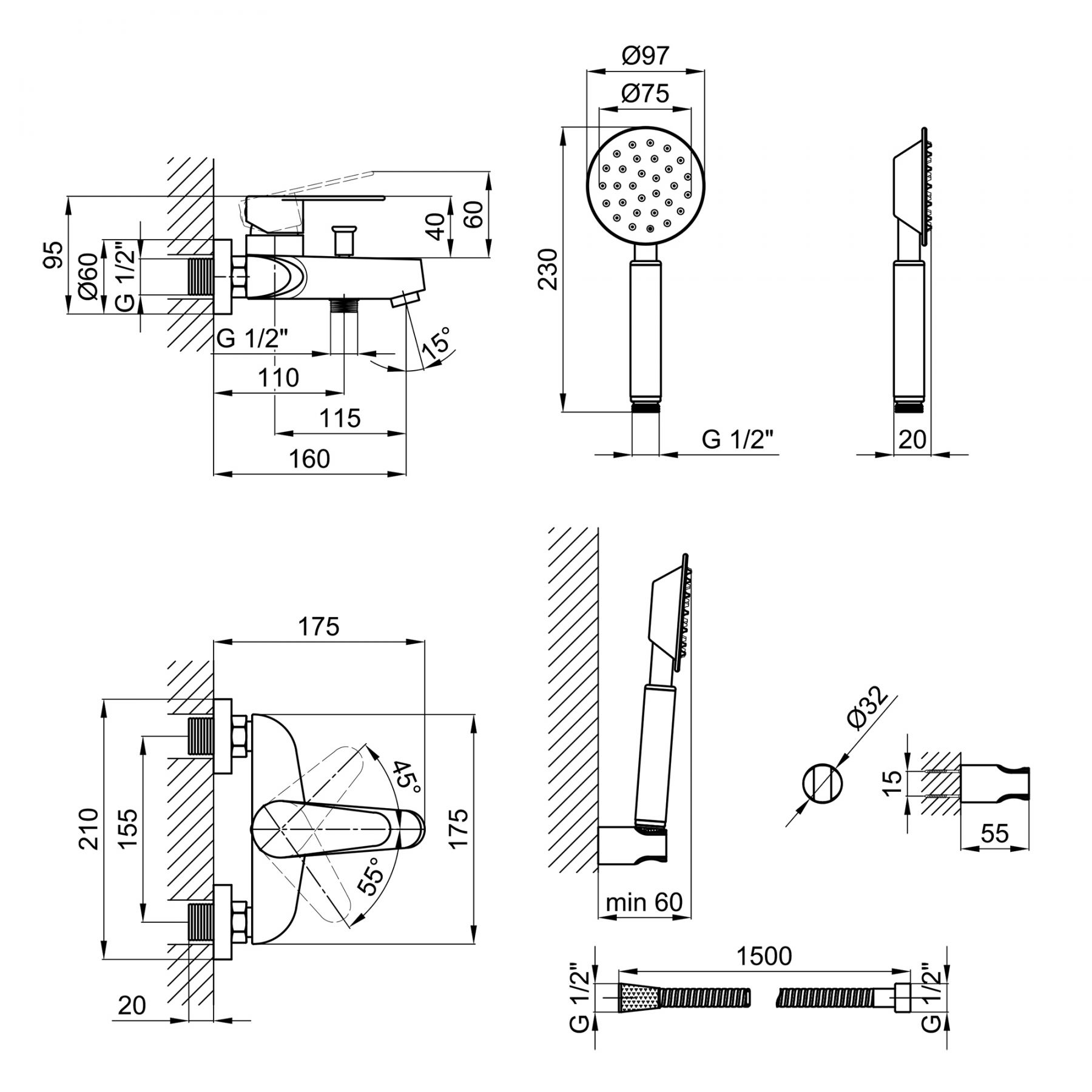 Комплектация:Смеситель, лейка для ручного душа, душевой шланг, кронштейн для ручного душа, крепежные детали.