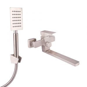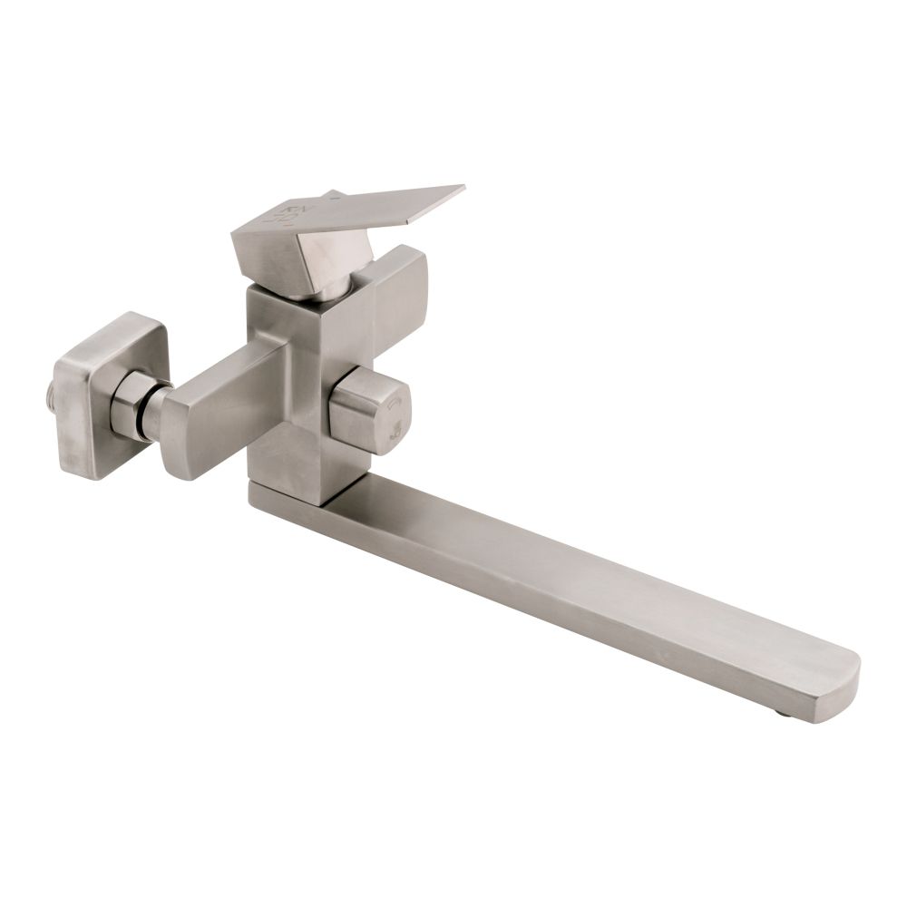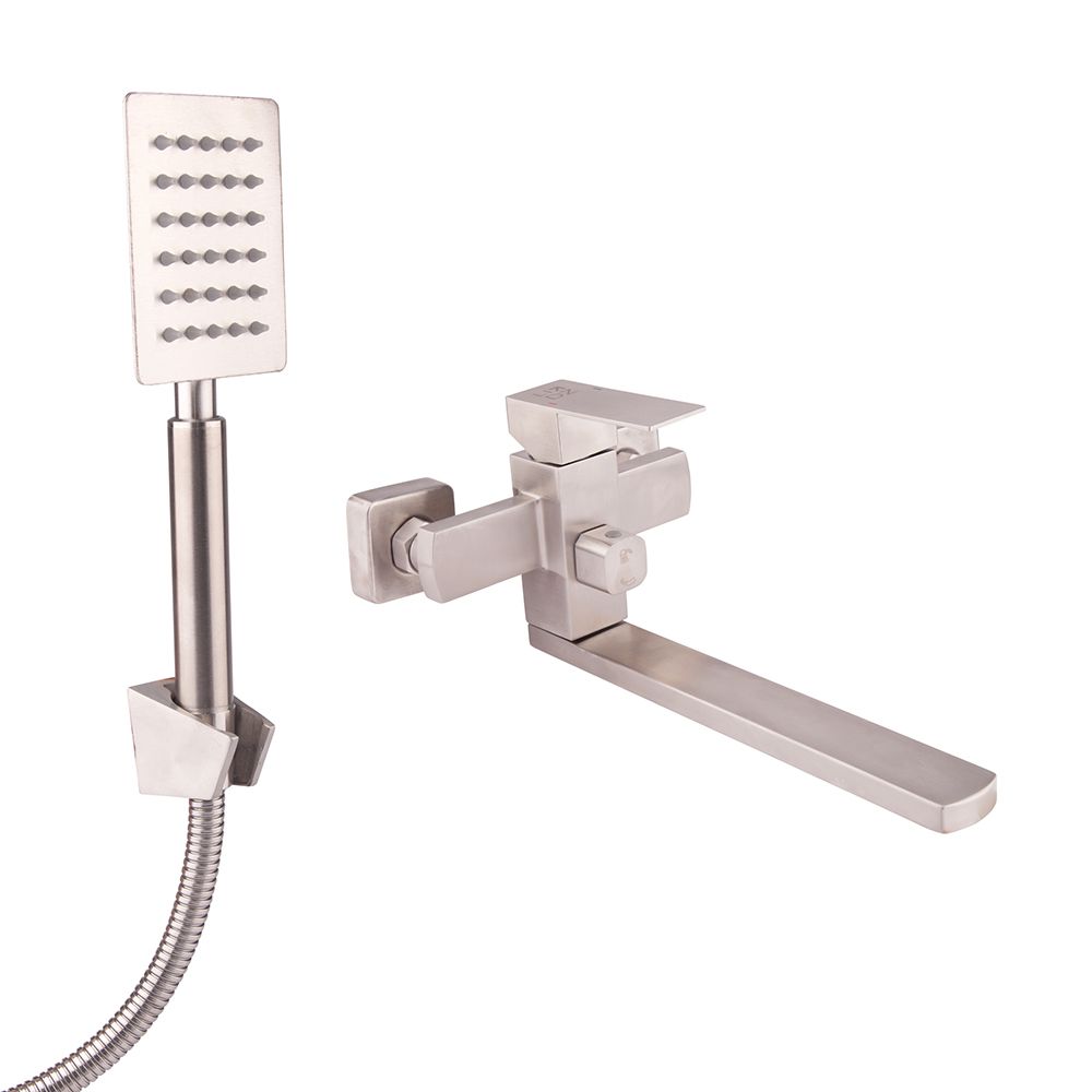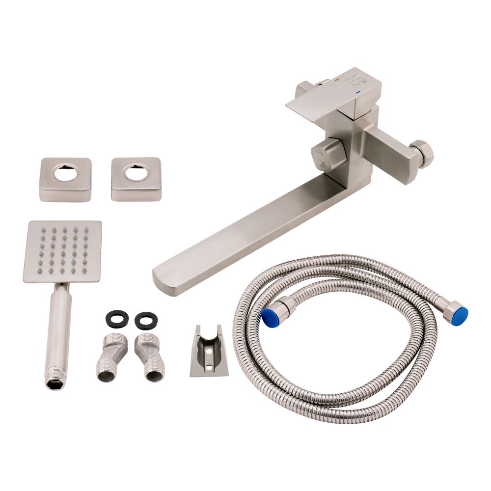 Смеситель для ванны Lidz (NKS) 10 30 005-1 выполнен в кубическом стиле из нержавеющей стали, что гарантирует длительный срок эксплуатации. Для включения подачи воды достаточно поднять рычаг и повернуть его в нужное положение. Смеситель монтируется на стену над ванной с помощью входящих в комплект крепежных элементов. Квадратные розетки скрывают погрешности установки на отделке. Держатель лейки также крепится на стену. Таким образом, ваши руки будут свободны во время принятия душа.