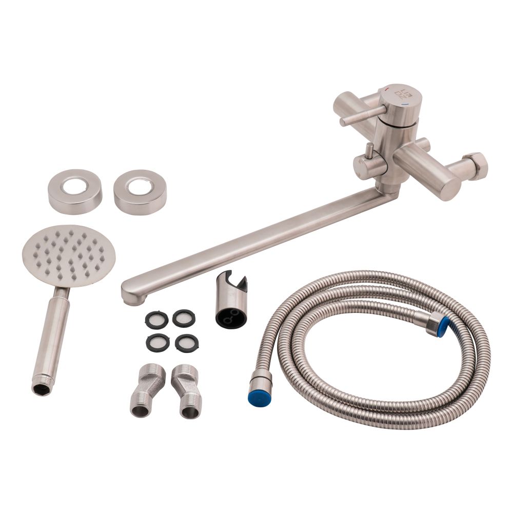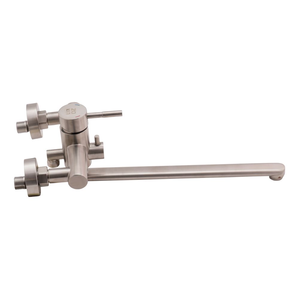 Смеситель для ванной Lidz (NKS) 12 32 005-1 выполнен из нержавеющей стали, что гарантирует длительный срок эксплуатации. Для включения подачи воды достаточно приподнять рычаг и повернуть его в необходимую сторону. Смеситель монтируется на стену над ванной с помощью крепежных элементов, которые комплектуются вместе со смесителем. Круглые розетки скрывают погрешности установки на обработке. Держатель лейки также крепится на стену. Таким образом, ваши руки будут свободны во время принятия душа.