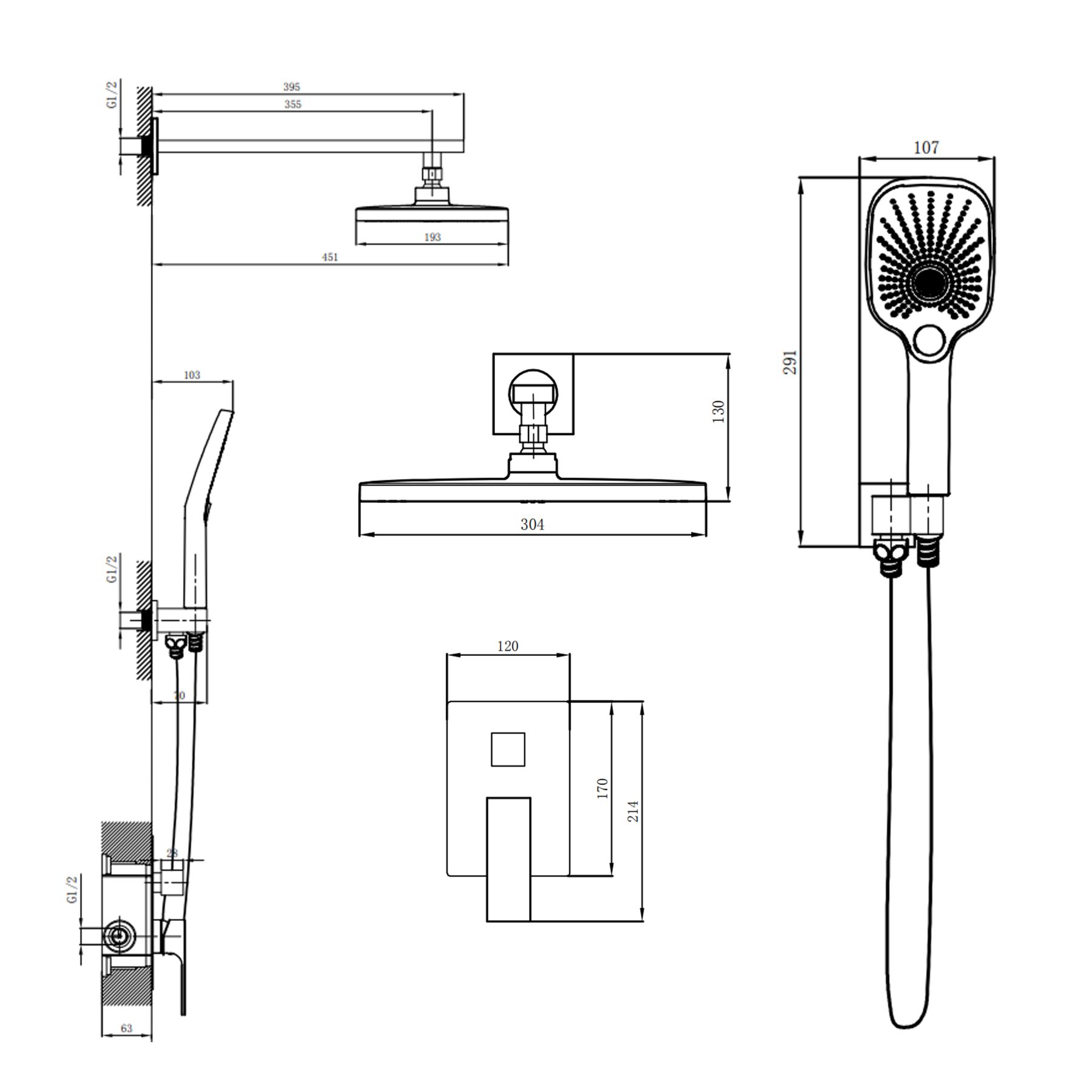 Комплектація:Змішувач, лійка для ручного душу, душовий шланг, кронштейн, деталі кріплення.