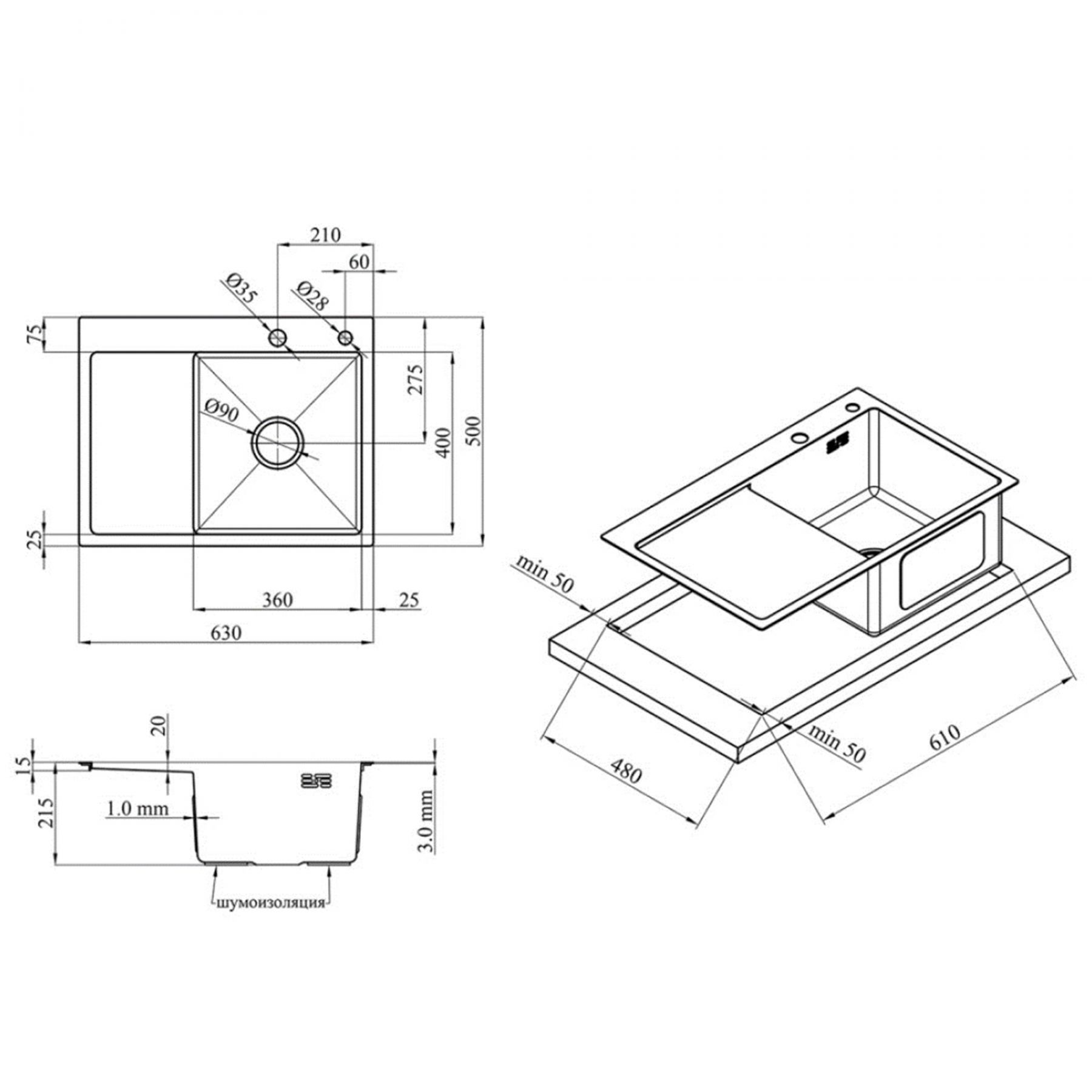 Мийка для кухні інтегрована Lidz Handmade H6350BL крило ліворуч (LDH6350BRUL45589) Brushed Black PVD 3,0/1,0 мм