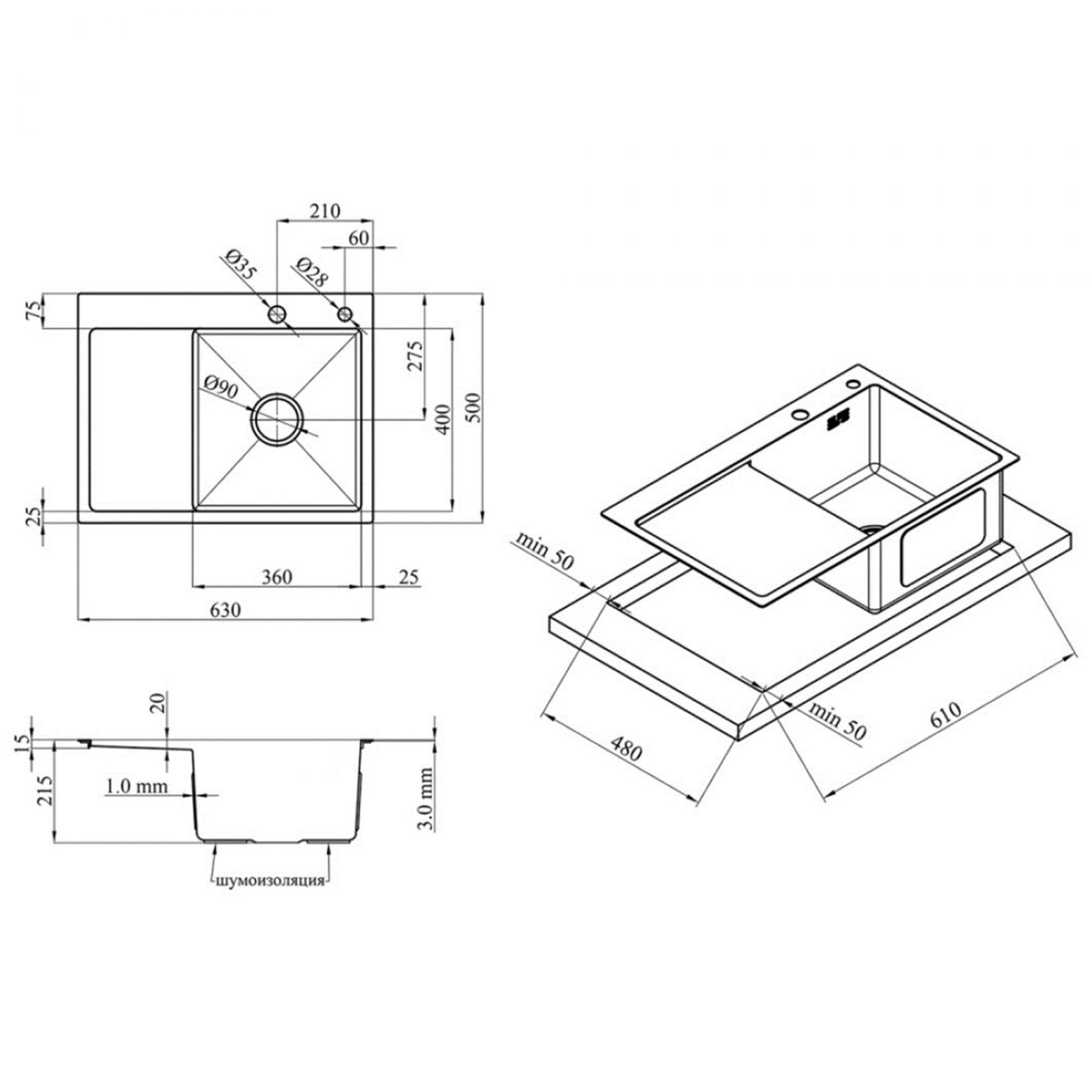 Мийка для кухні інтегрована Lidz Handmade H6350L крило ліворуч (LDH6350BRUL45588) Brushed Steel 3,0/1,0 мм